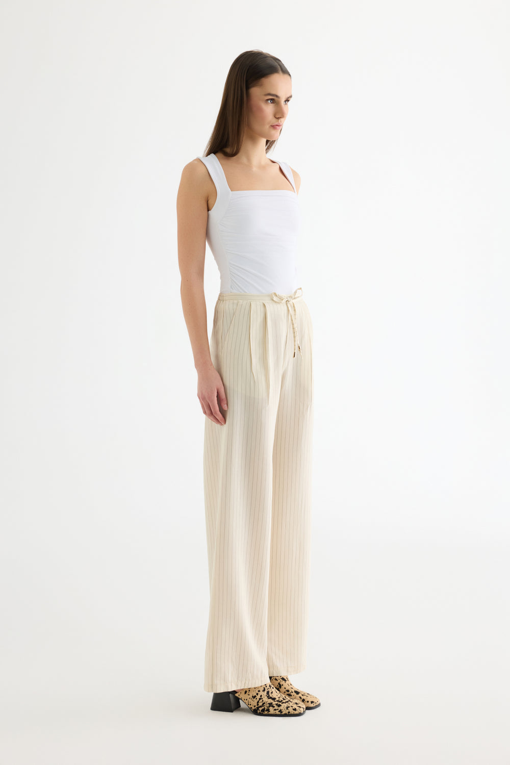 Çizgili Bağcıklı Bol Paça Pantolon Ekru
