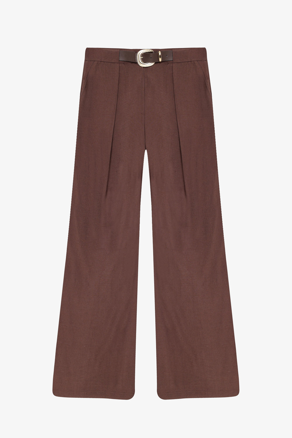 Çift Pile Kemerli Palazzo Pantolon Kahverengi