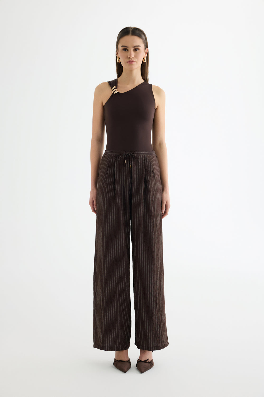 Çizgili Bağcıklı Bol Paça Pantolon Kahverengi