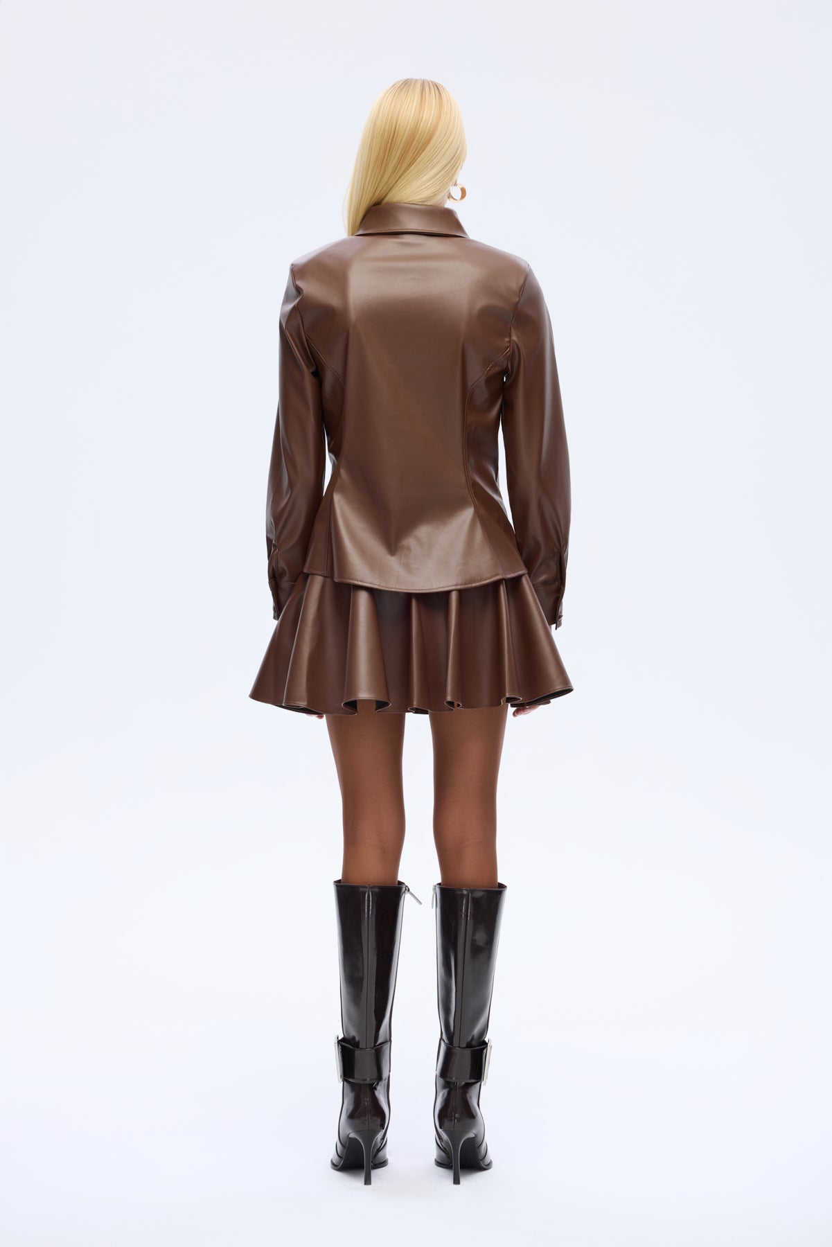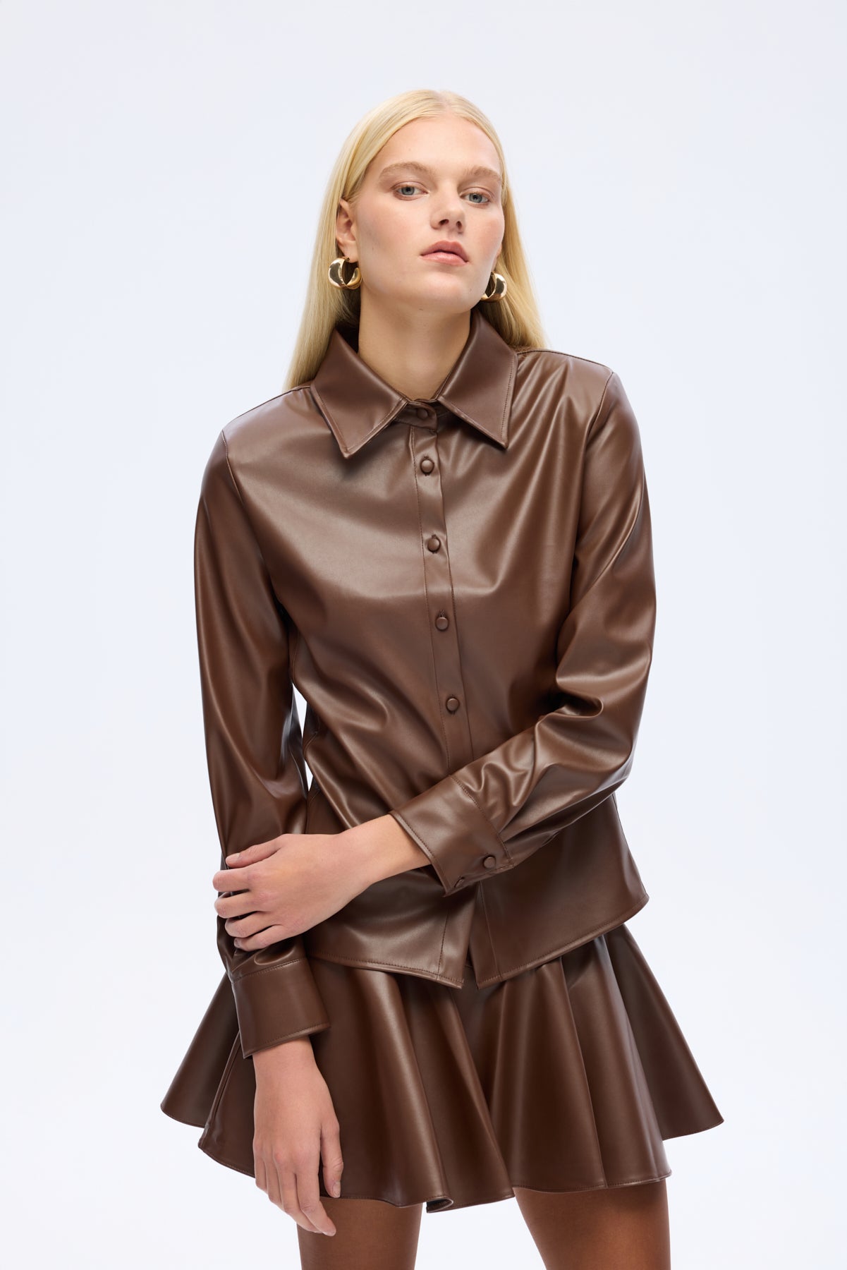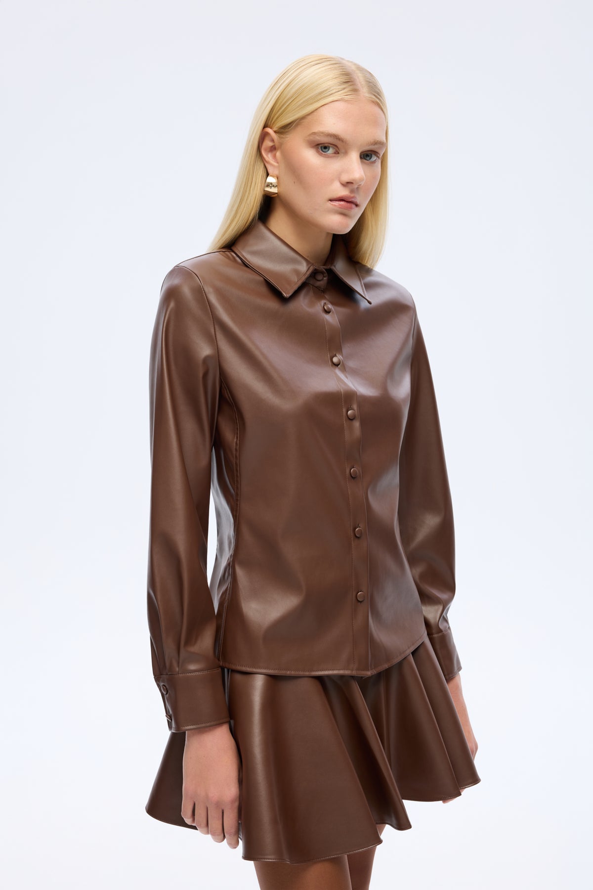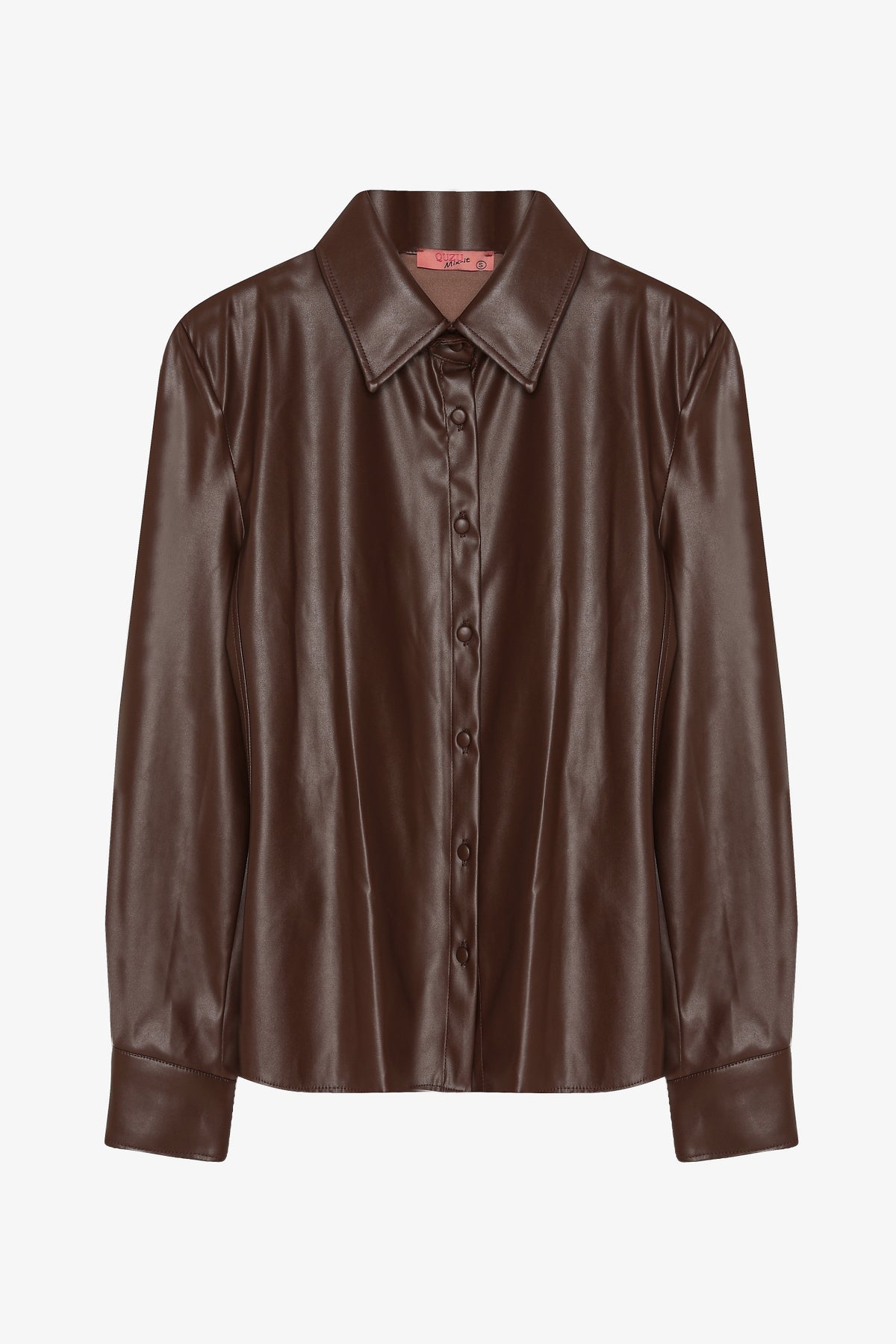 Suni deri kumaştan, önden düğme kapamalı, uzun kollu, bele oturan formda, klasik yaka gömlek.