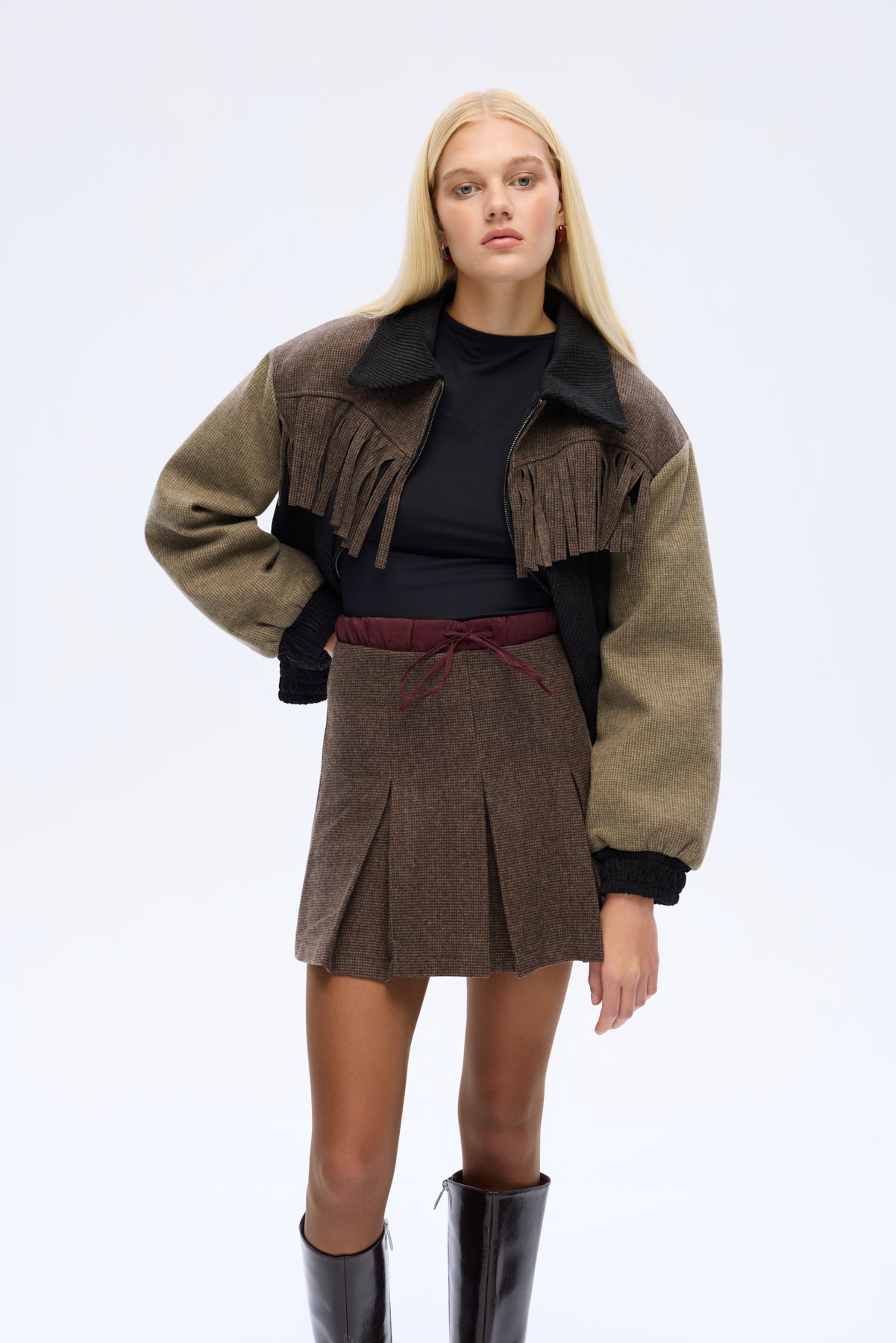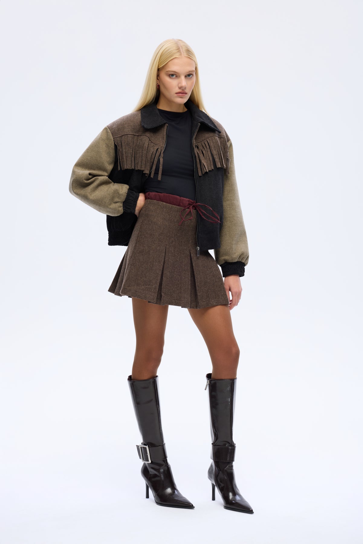 Beli Bağcıklı Pileli Mini Etek Kahverengi