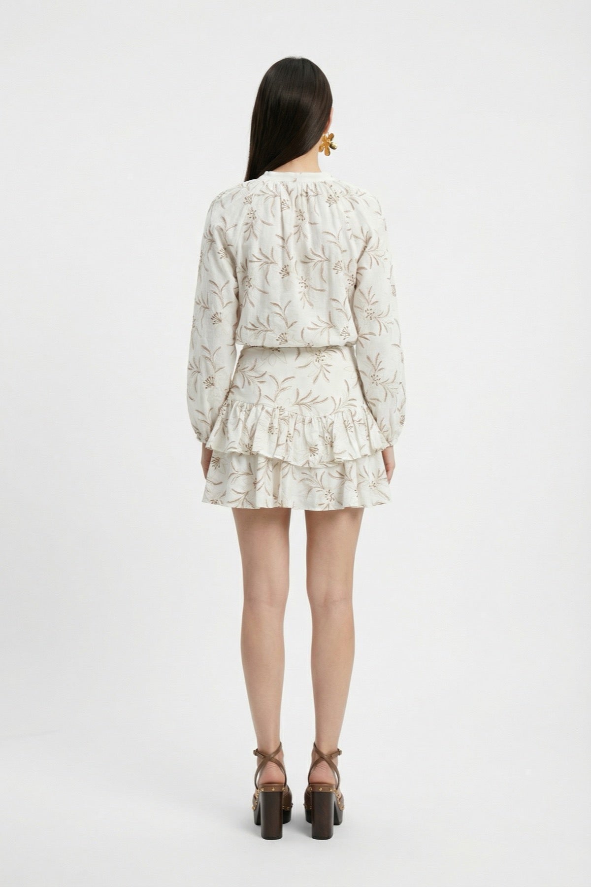 Çiçek Nakışlı Fırfırlı Mini Etek Ekru