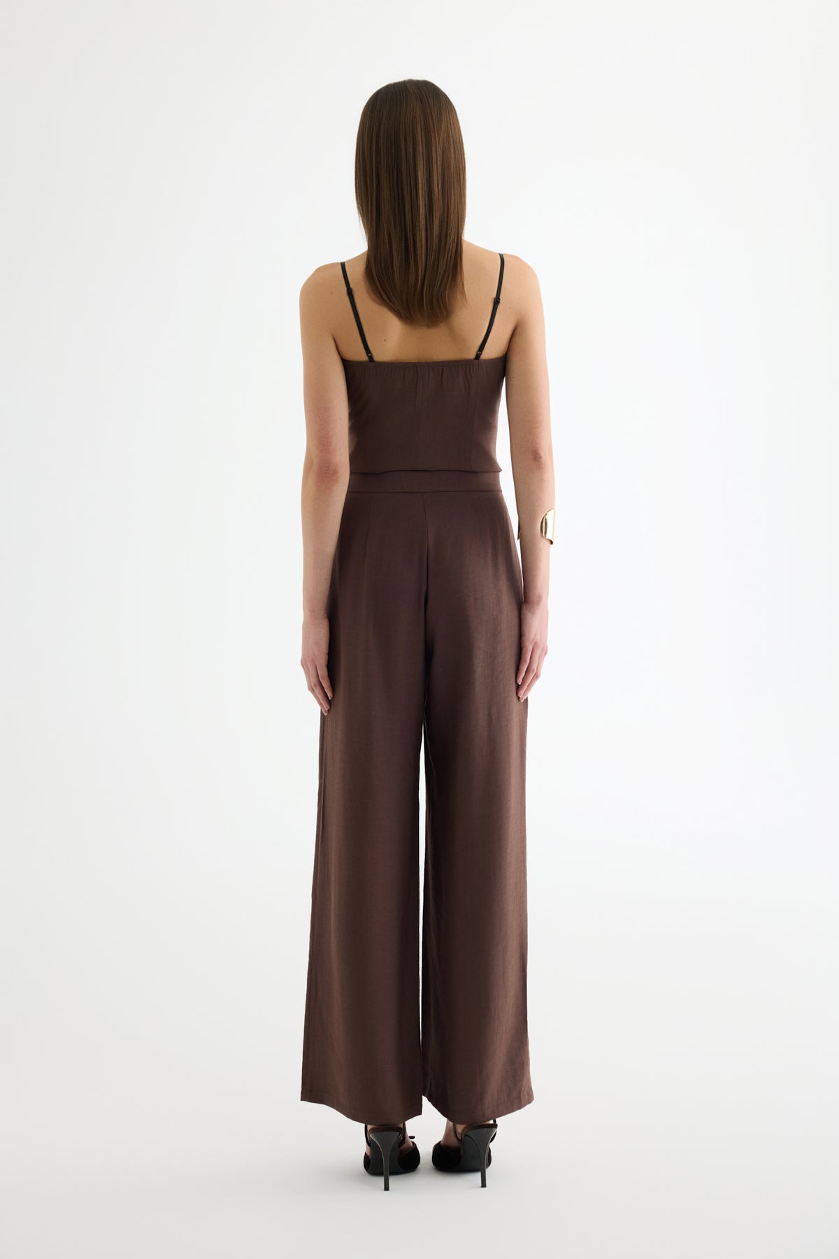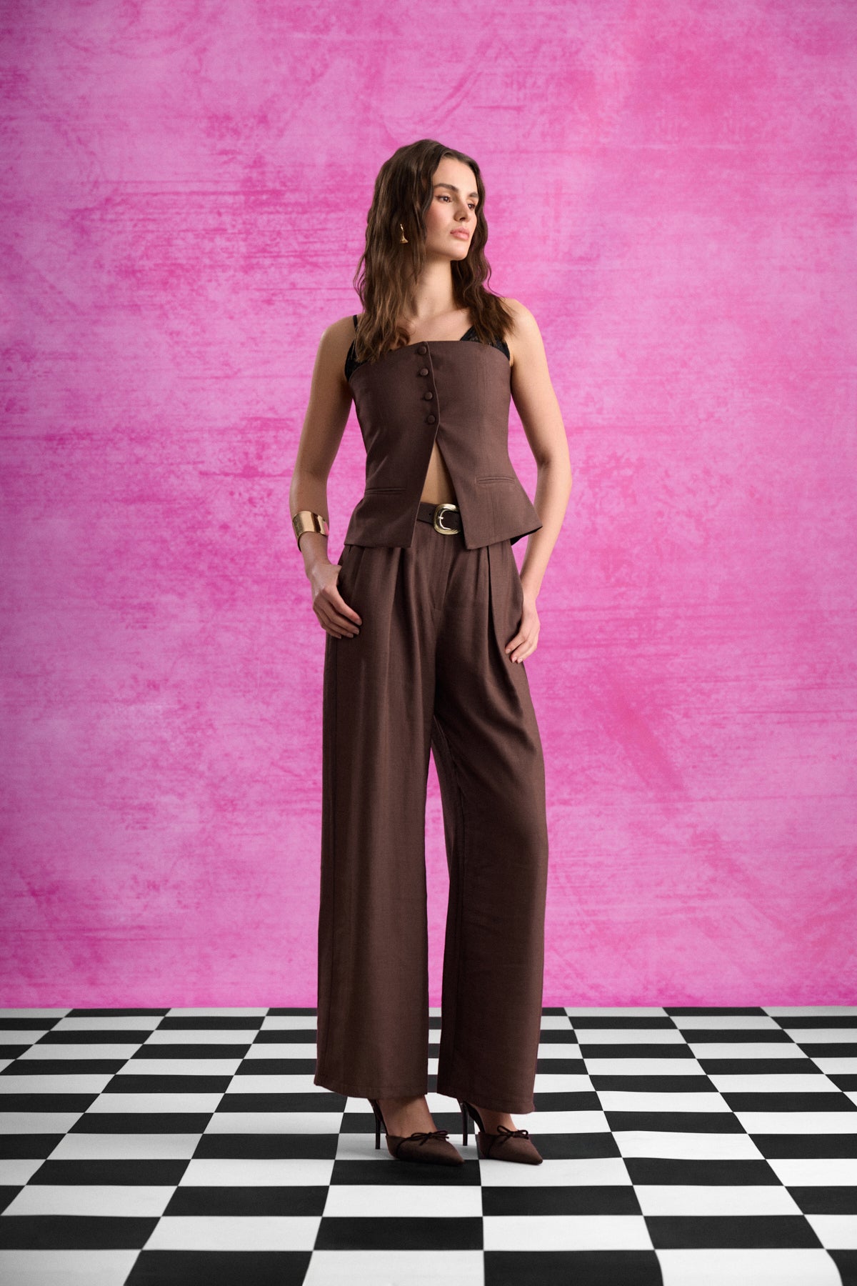 Çift Pile Kemerli Palazzo Pantolon Kahverengi