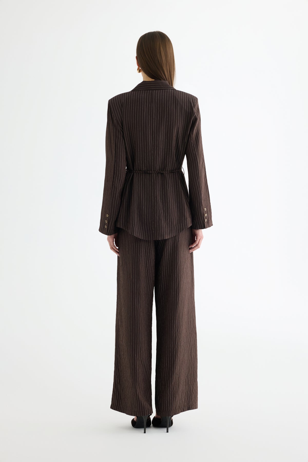 Kruvaze yaka formda, çizgili dokulu, bağlama detaylı, düğme kapamalı, astarlı, uzun kollu gömlek ceket.