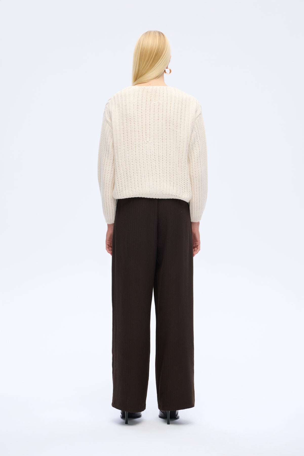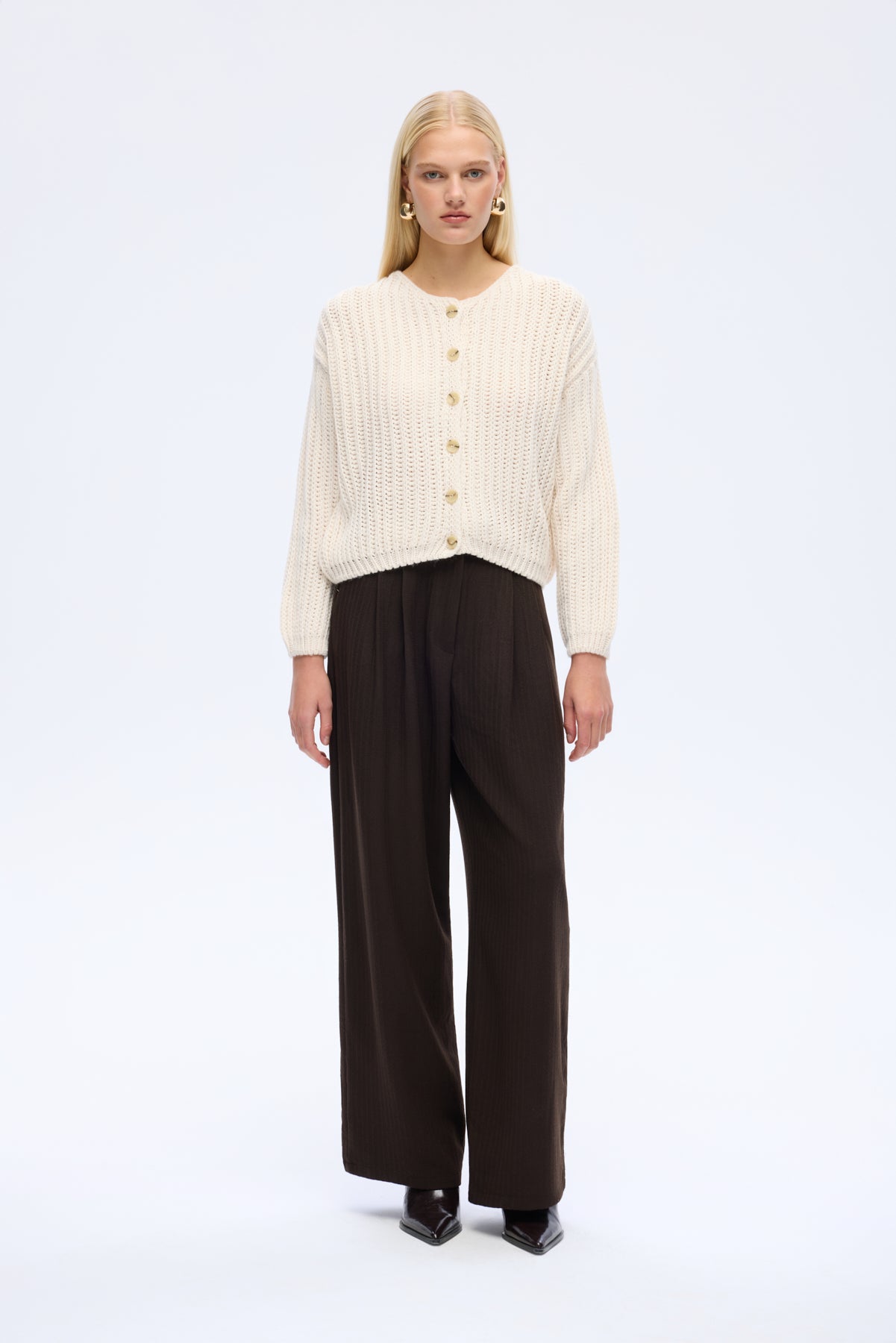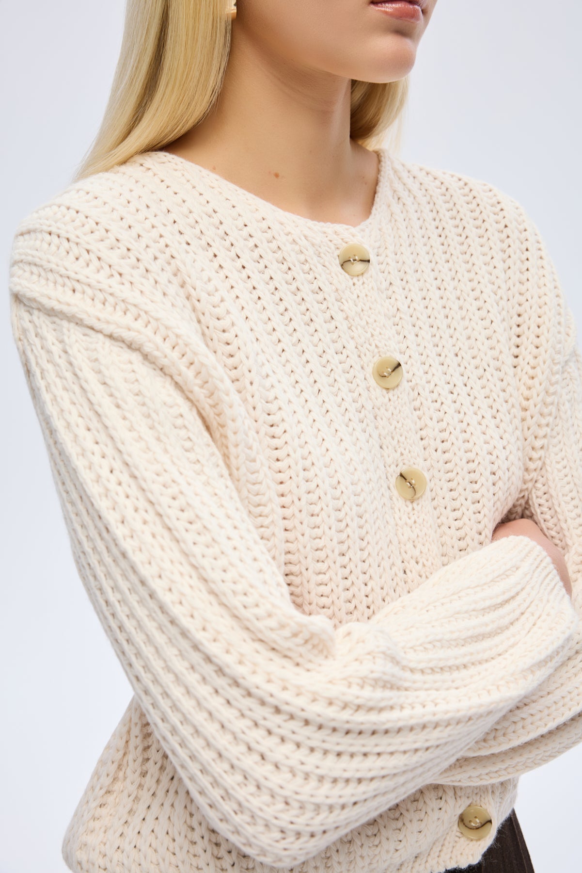 Bisiklet yaka, düğme kapama detaylı, uzun kollu, kalın örgü desenli kısa boy triko hırka.