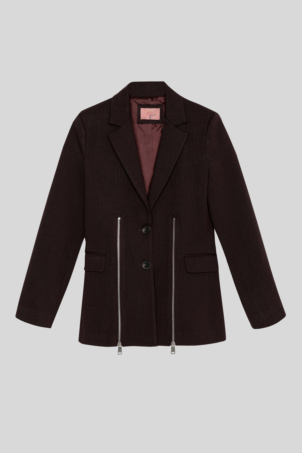 İçi astarlı, kruvaze yaka, çizgili kumaştan, önü düğme kapamalı, cep kapaklı, omuzları vatkalı, açılabilir çift fermuar detaylı, uzun kollu blazer ceket.
