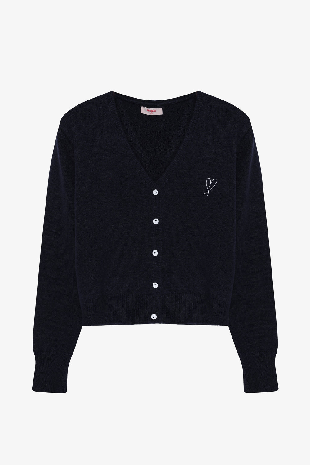 Kalp Nakışlı Düğmeli V Yaka Triko Hırka Lacivert