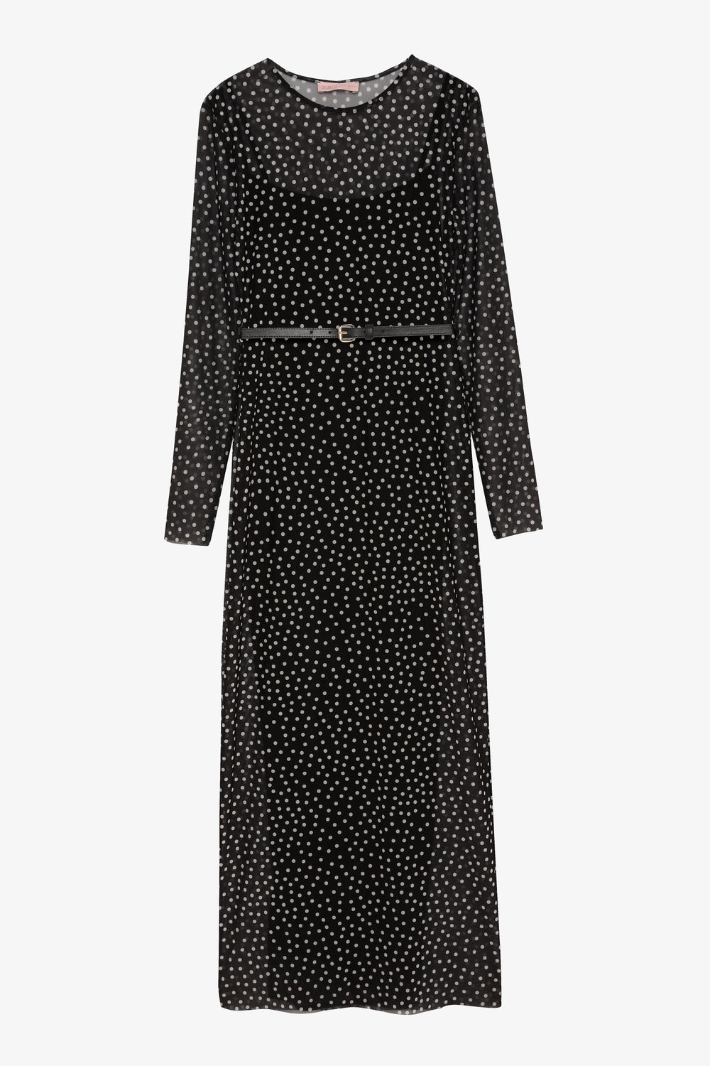 Kemer Aksesuarlı Puantiyeli Transparan Midi Elbise Siyah