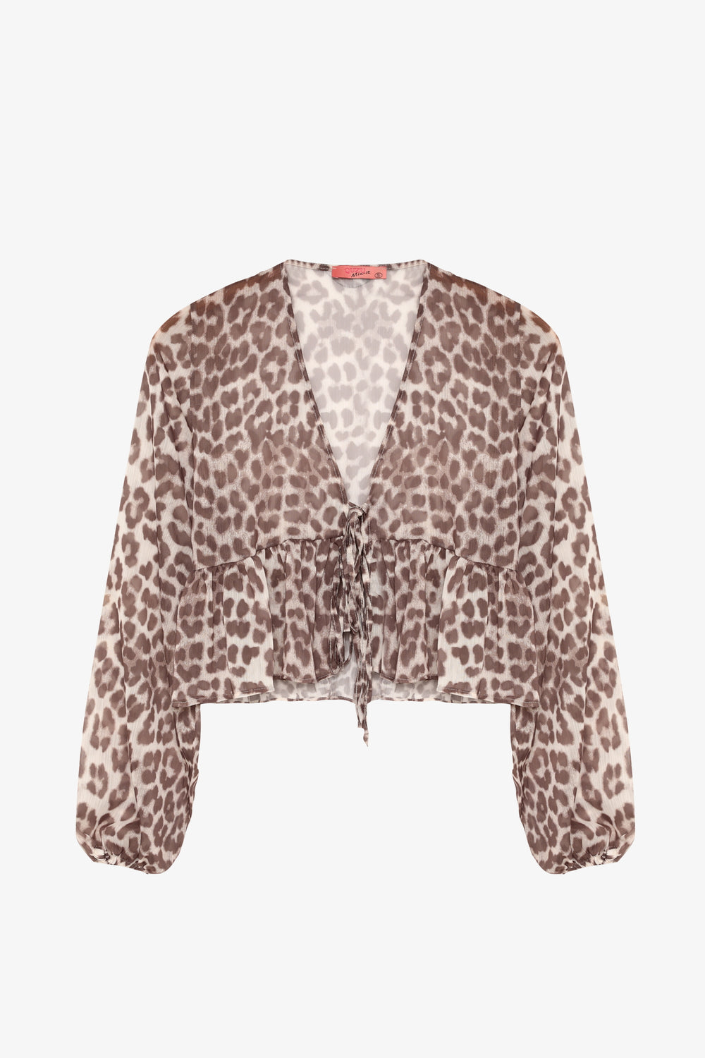Astarsız, transparan görünümde iç gösterebilmektedir, v yaka, önden açılabilir bağlama detaylı, uzun kollu, leopar desenli, kısa tül bluz.