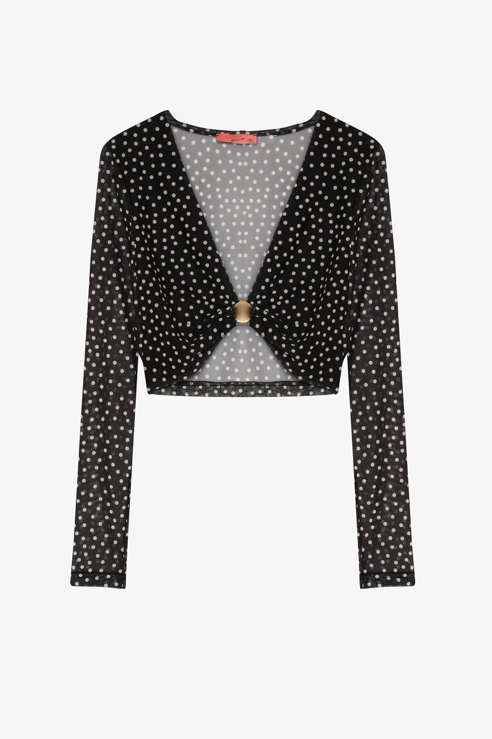 İçi astarsız, transparan görünümde tül kumaştan, uzun kollu, puantiye desenli, önü gold toka aksesuarlı, crop bluz.
