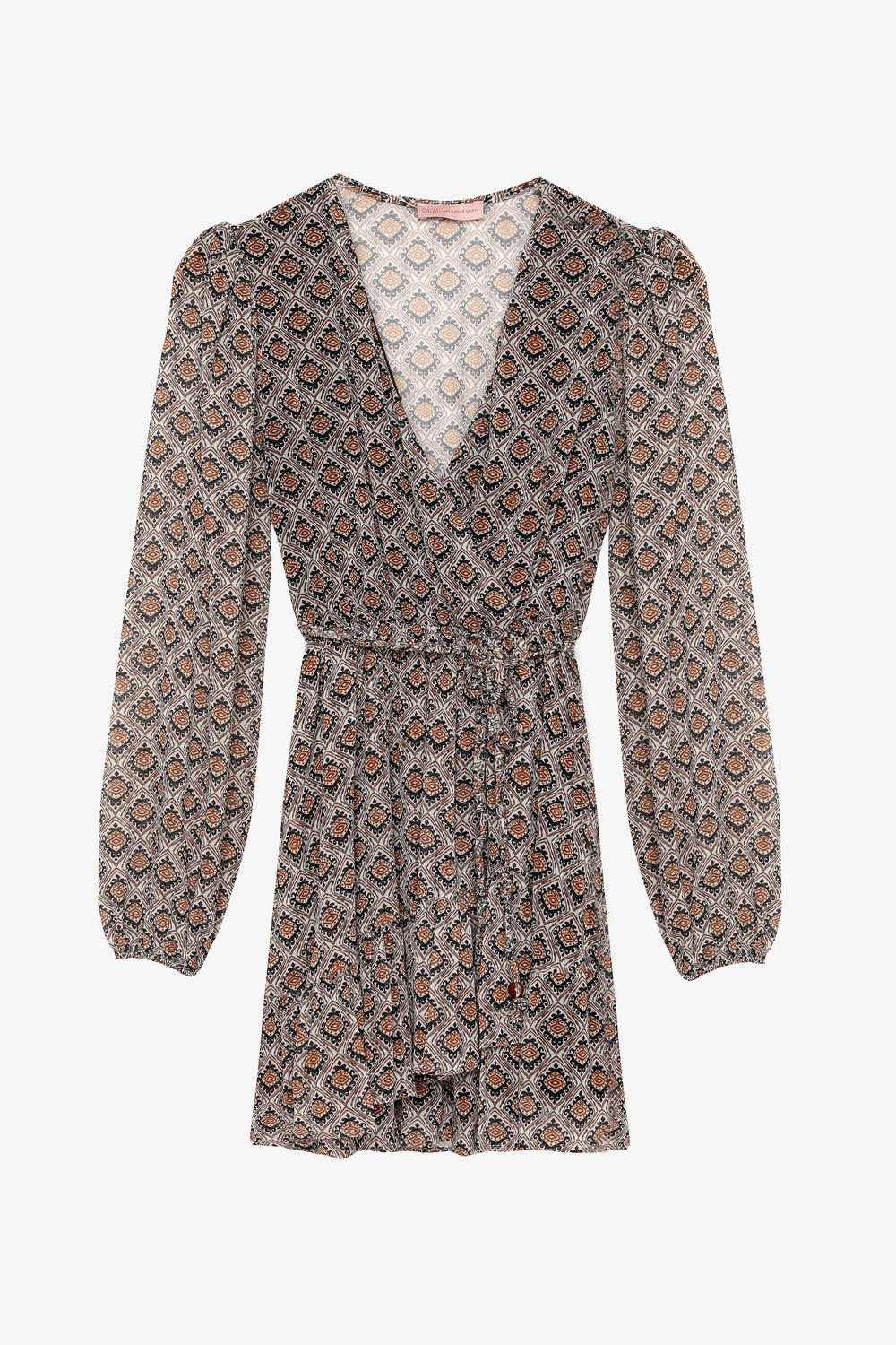 Retro Geometrik Desenli Kruvaze Yaka Mini Elbise Kahverengi