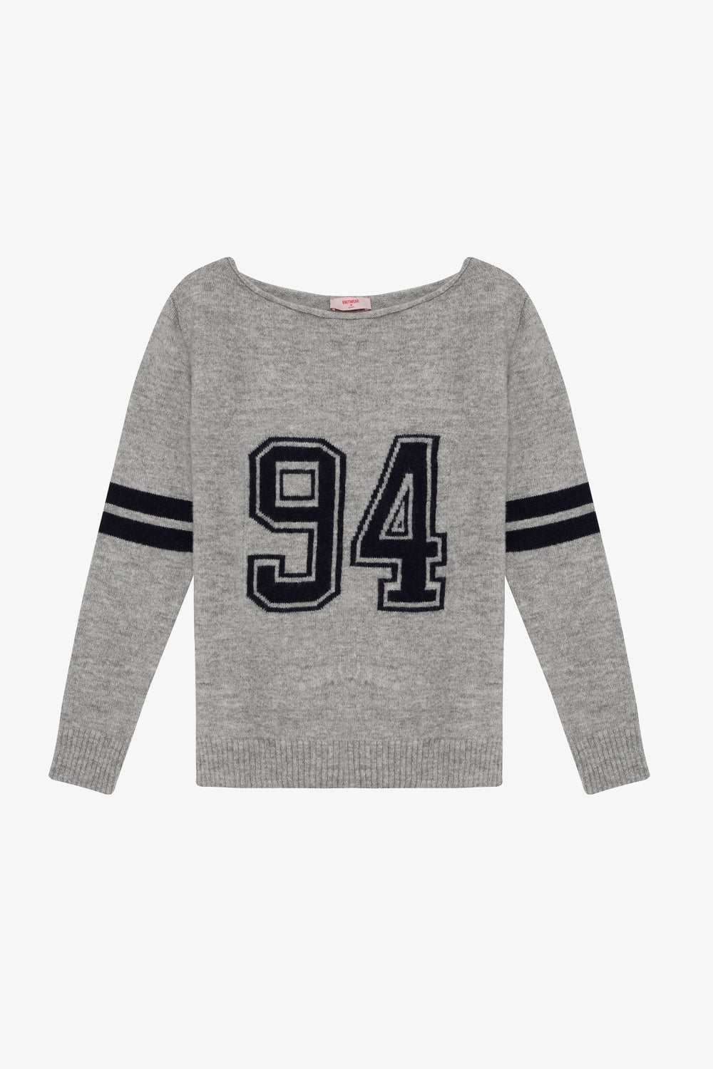 Ön kısmı sayı nakış detaylı, kayık yaka, uzun kollu, kol üzerinde şerit desenli, ribana manşetli triko kazak.