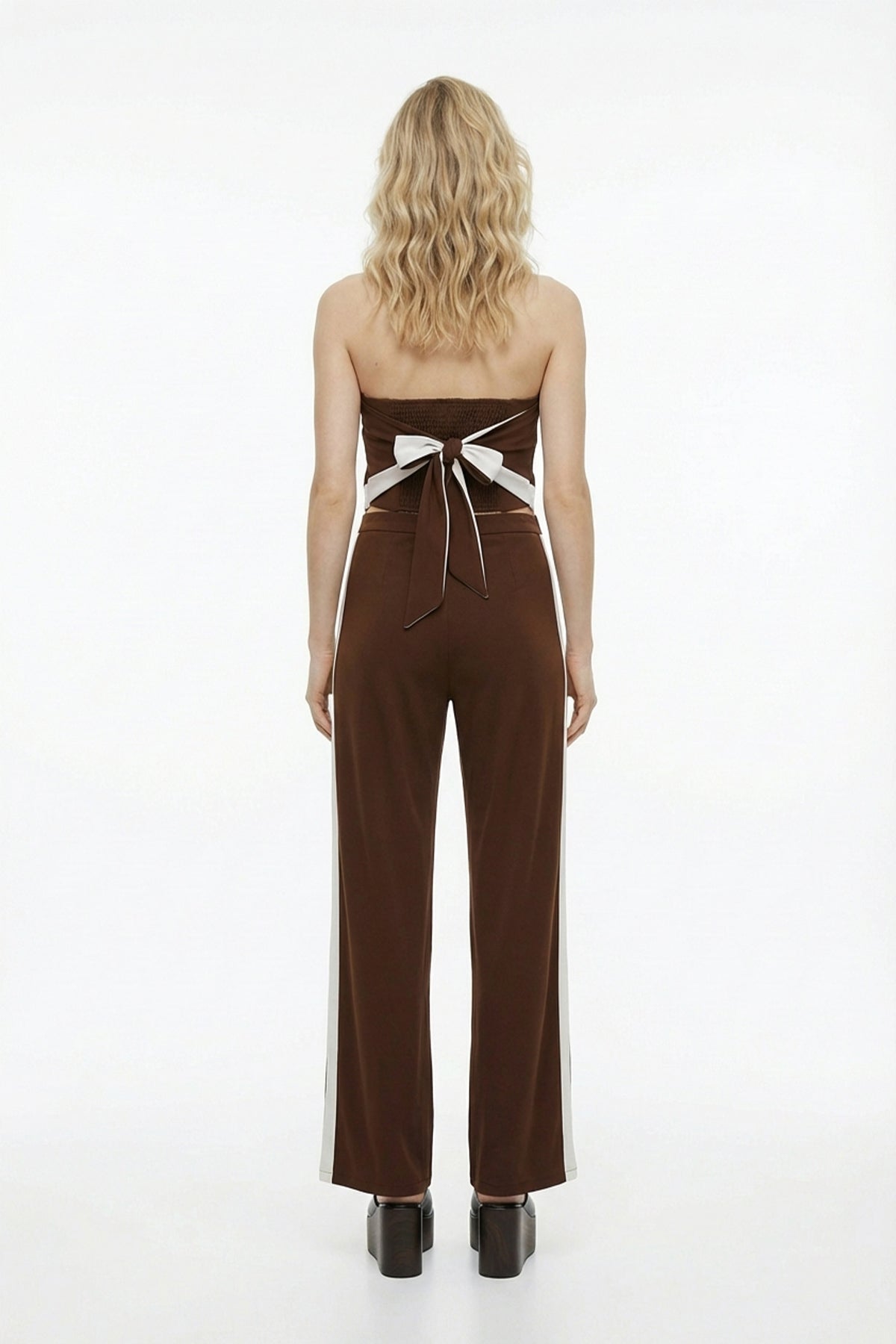 Straplez yaka, sırtı gipeli, kontrast görünümde, arkası bağlama detaylı, beli oturan, kolsuz, önü üçgen görünümde, crop bluz.