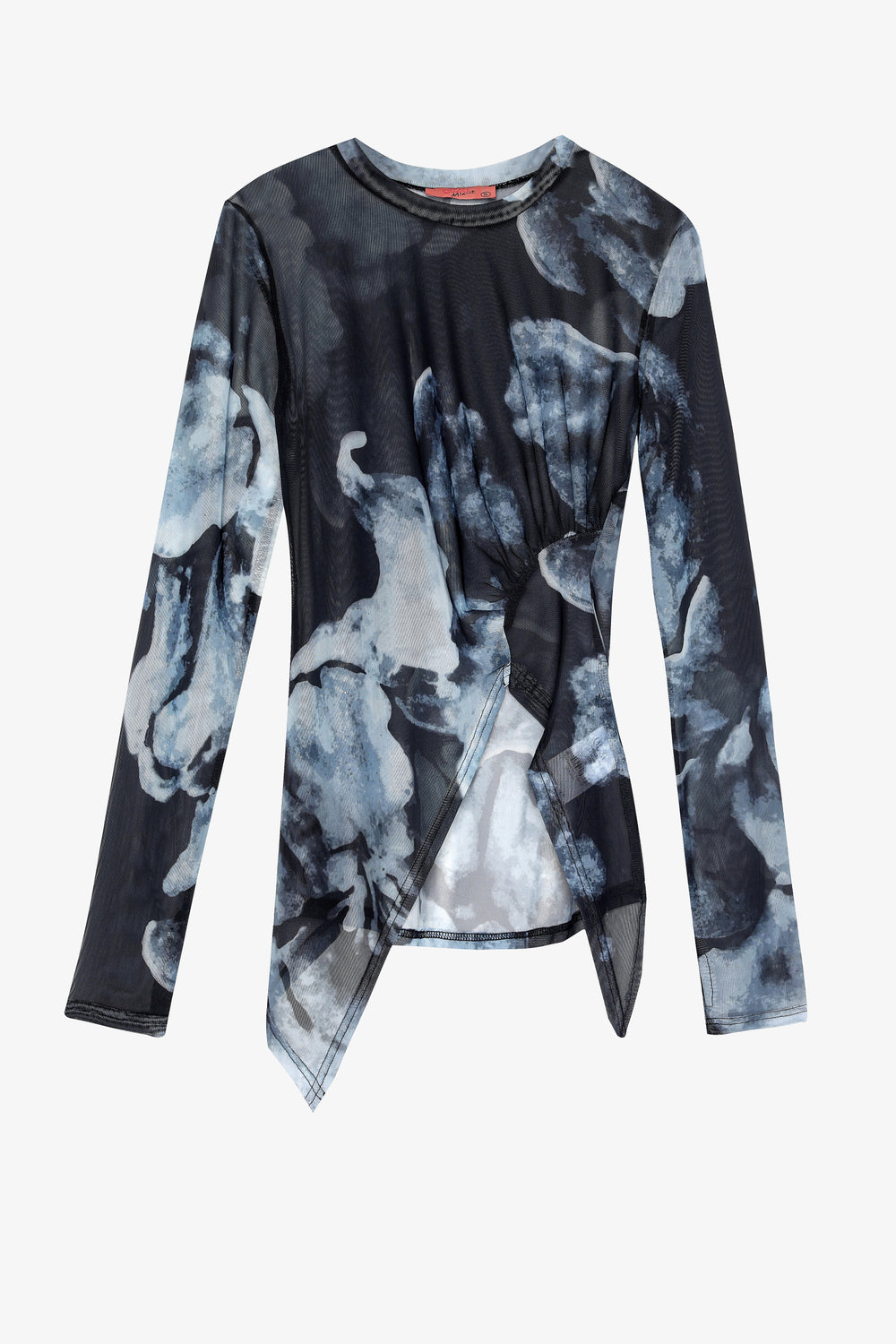 İçi astarsız, transparan görünümde, asimetrik kesim yırtmaçlı etek uçlu, büzgü detaylı, çiçek desenli tül kumaştan, uzun kollu bluz.