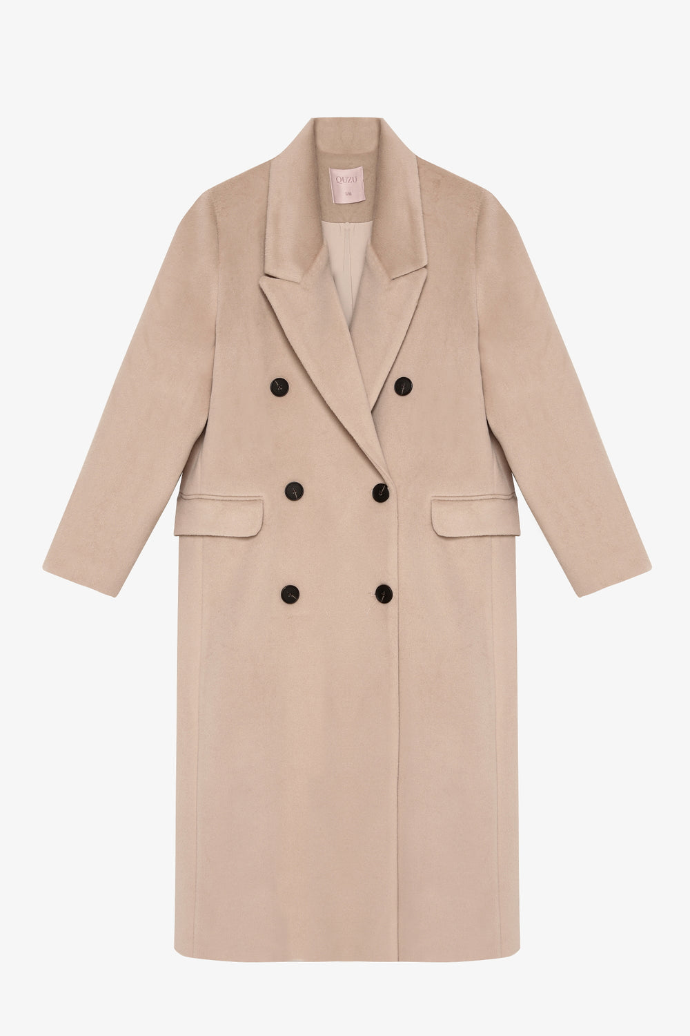 İçi kendi renginden astarlı, kruvaze düğme kapamalı, vatkalı omuzlu, uzun kollu, cep kapaklı, yırtmaç detaylı, uzun kaşe kaban.