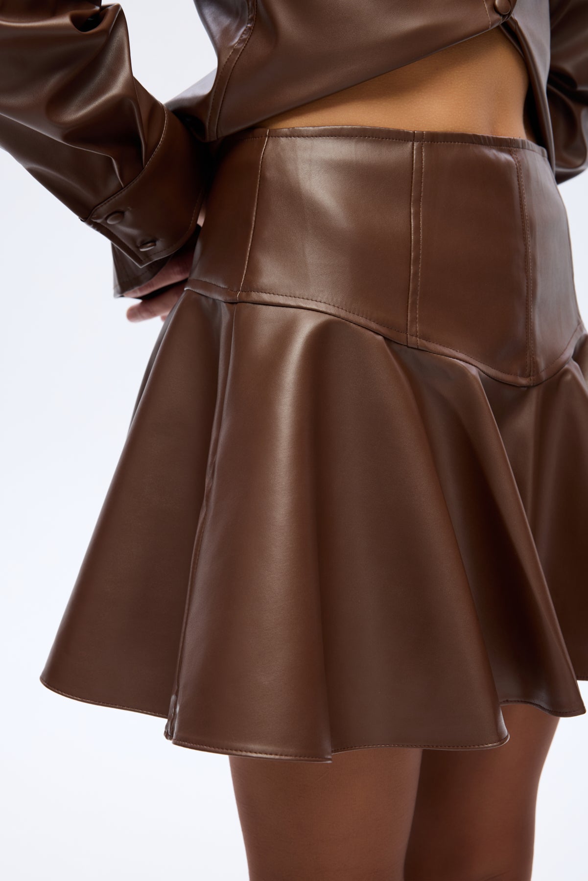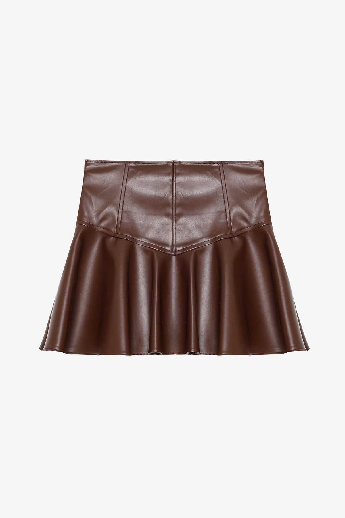 İçi şort astarlı, yüksek bel kesimli, suni deri görünümlü kumaştan, volan detaylı, yandan fermuar kapamalı, mini boy etek.