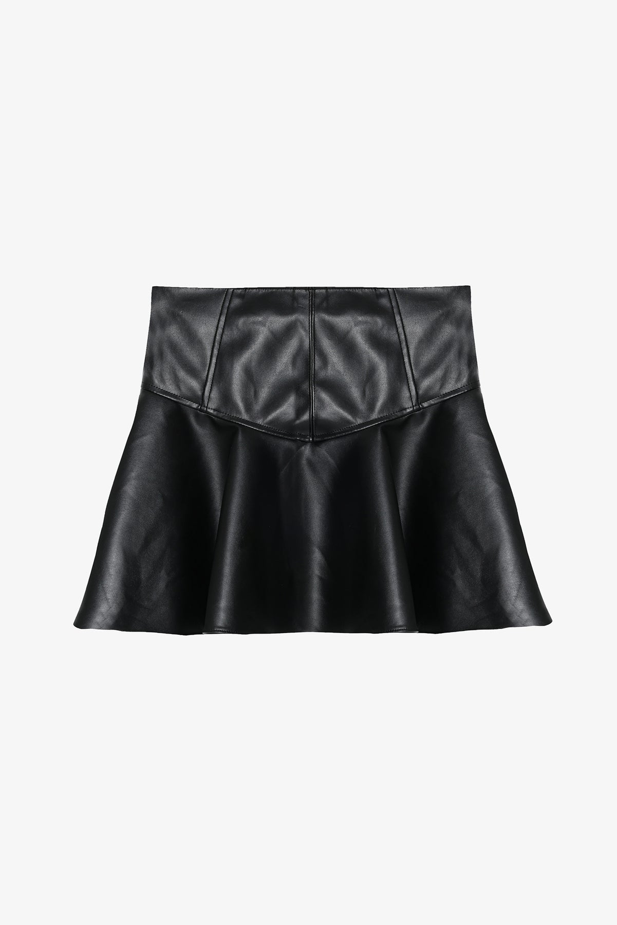 İçi şort astarlı, yüksek bel kesimli, suni deri görünümlü kumaştan, volan detaylı, yandan fermuar kapamalı, mini boy etek.