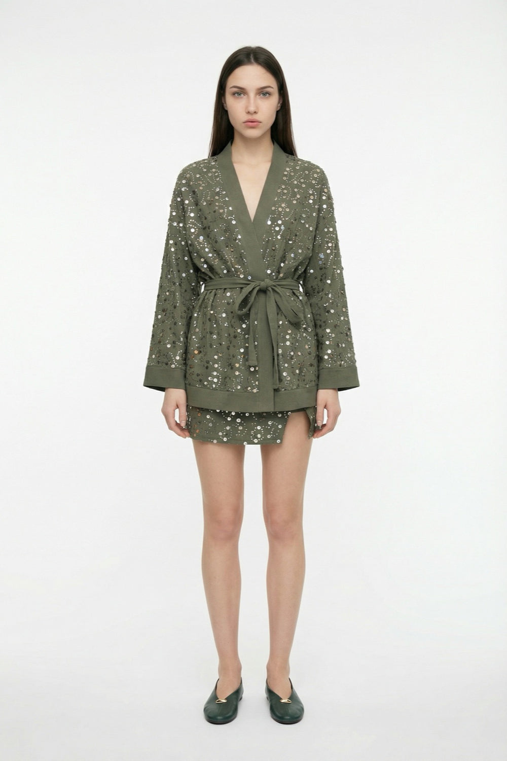 Pul İşlemeli Kuşaklı Kısa Kimono Haki