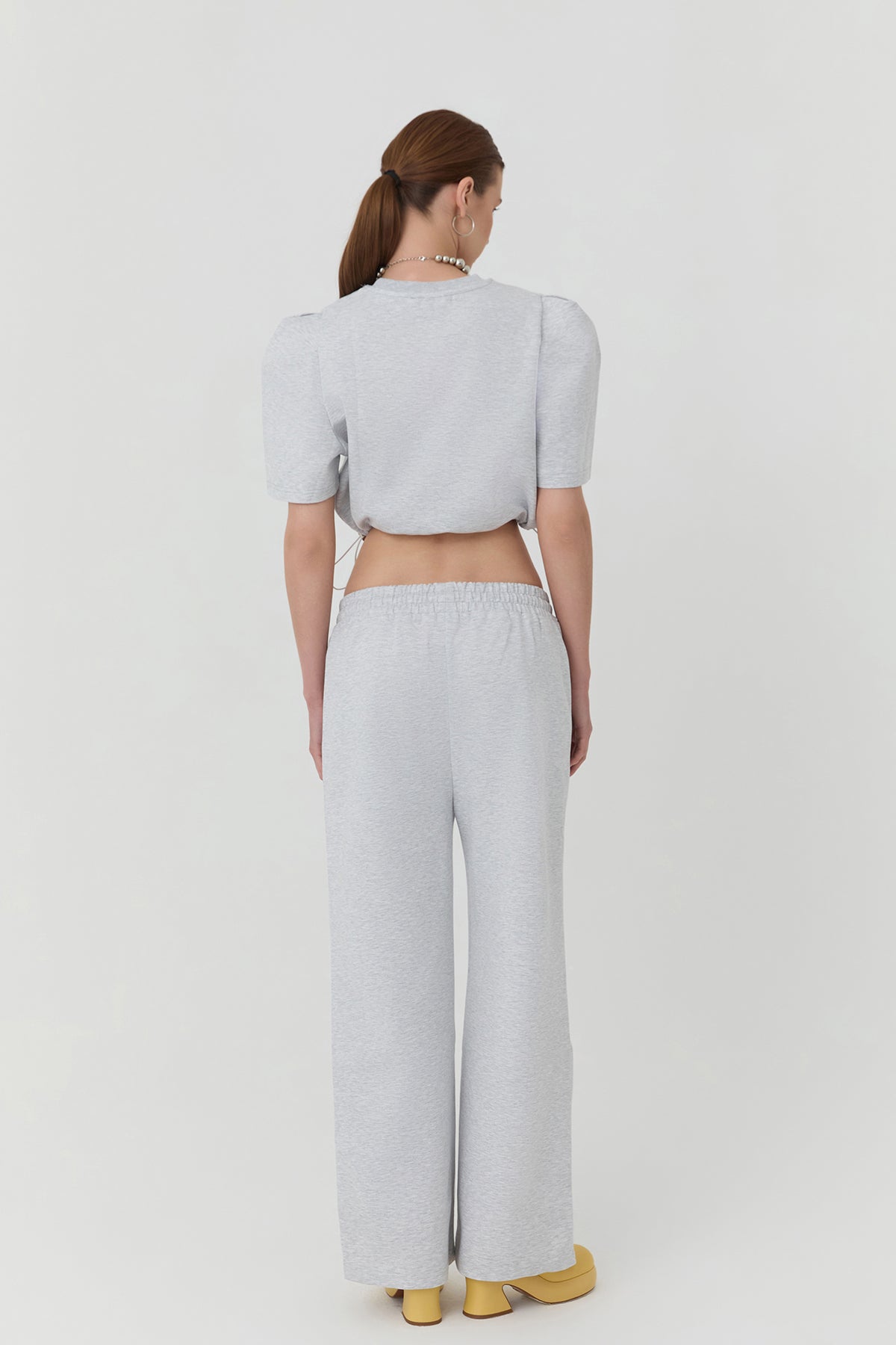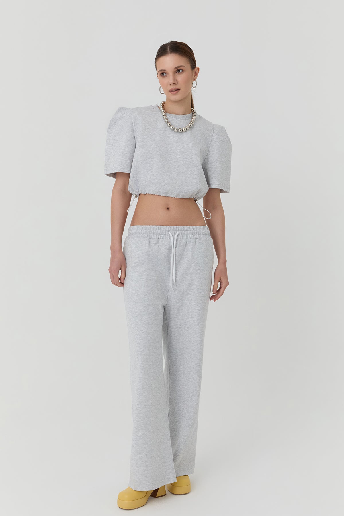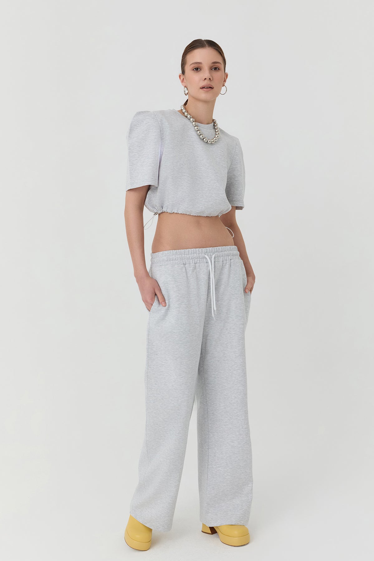 Beli lastik ve bağlamalı, çift cepli, geniş paça eşofman.
