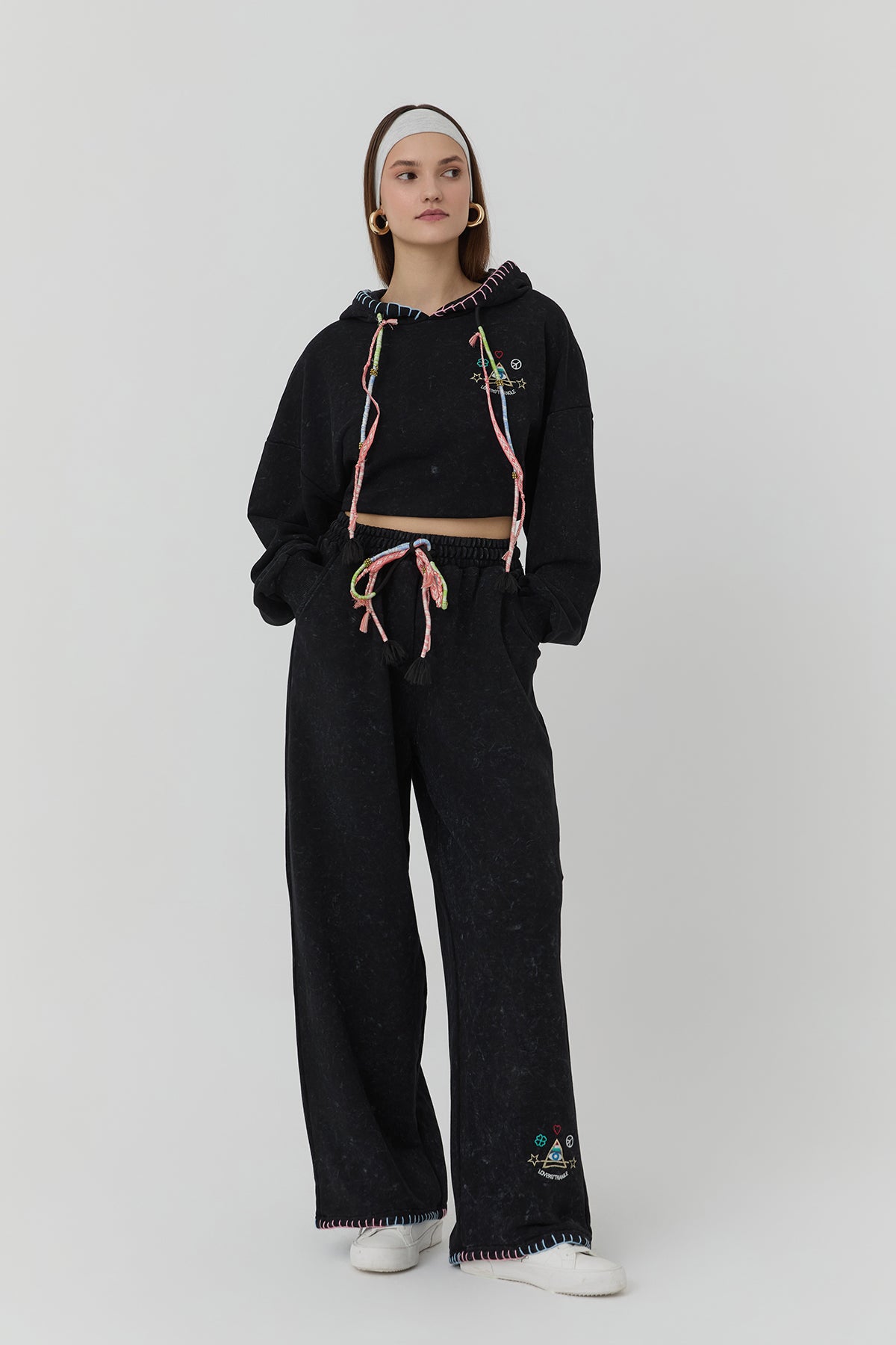 Belİ lastİklİ, renklİ bağlama detaylı, eskİtme görünümlü, genİş paça, paçasında nakış detaylı, çİft ceplİ eşofman.