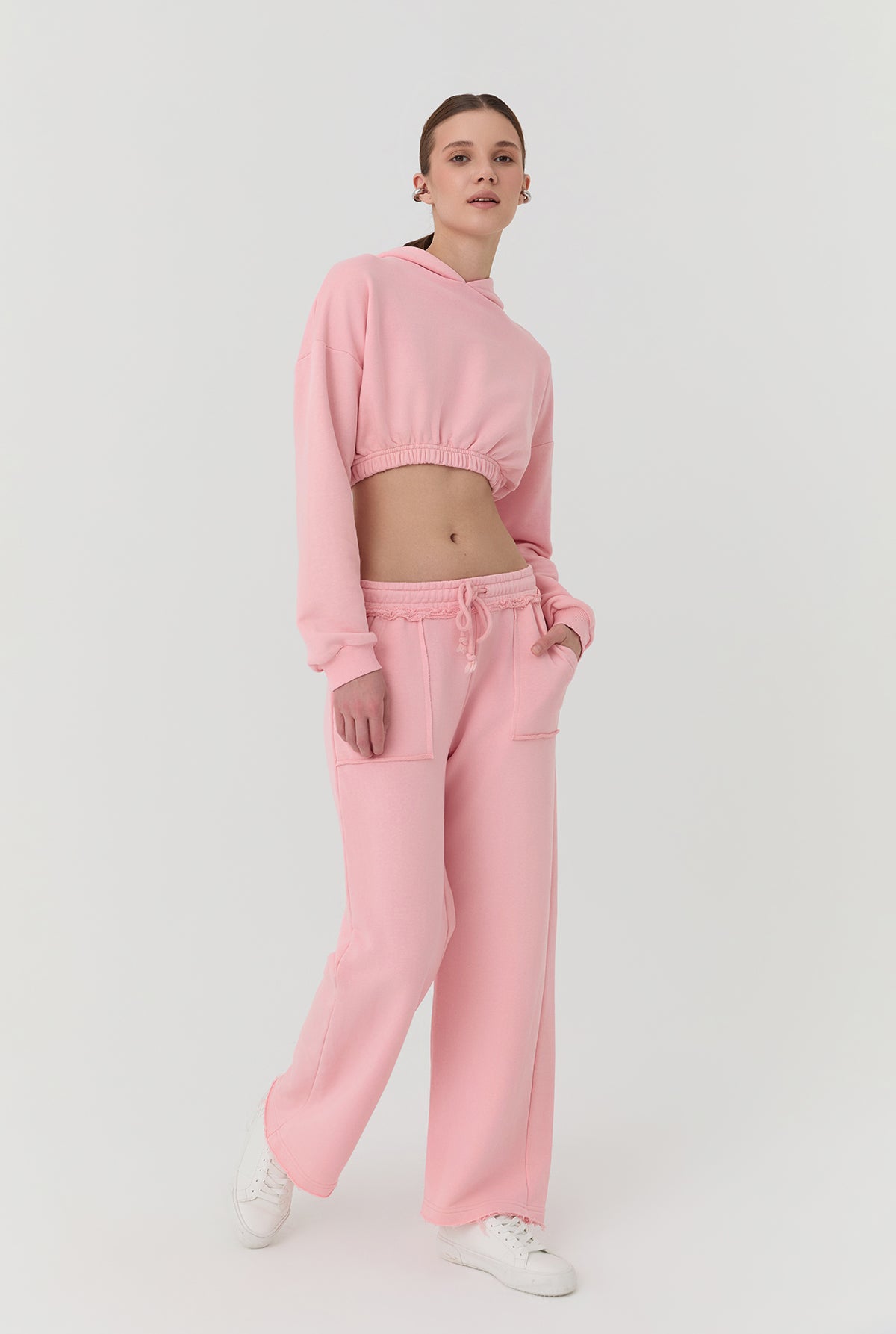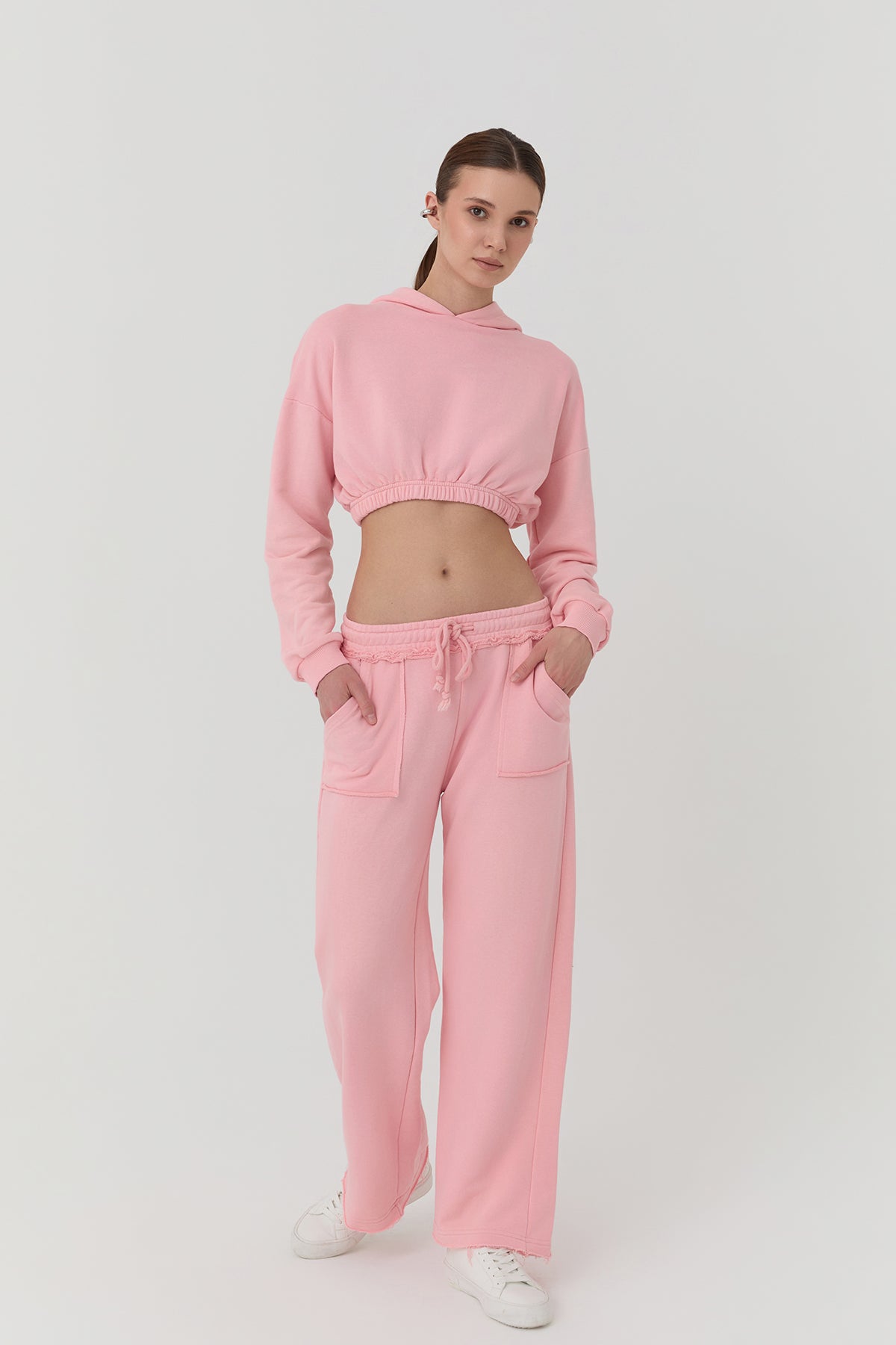Belİ lastİklİ, çİft ceplİ, İp bağlamalı, düz paça eşofman.