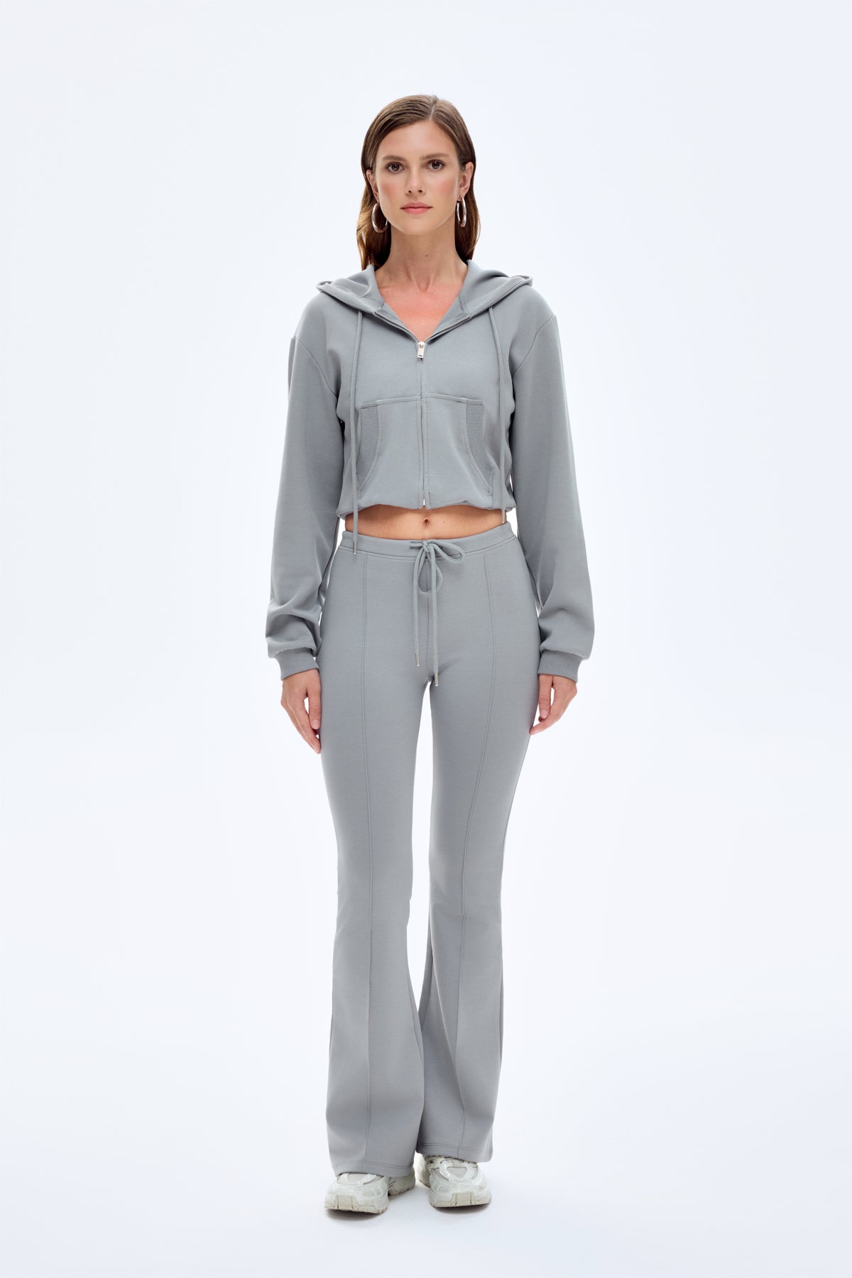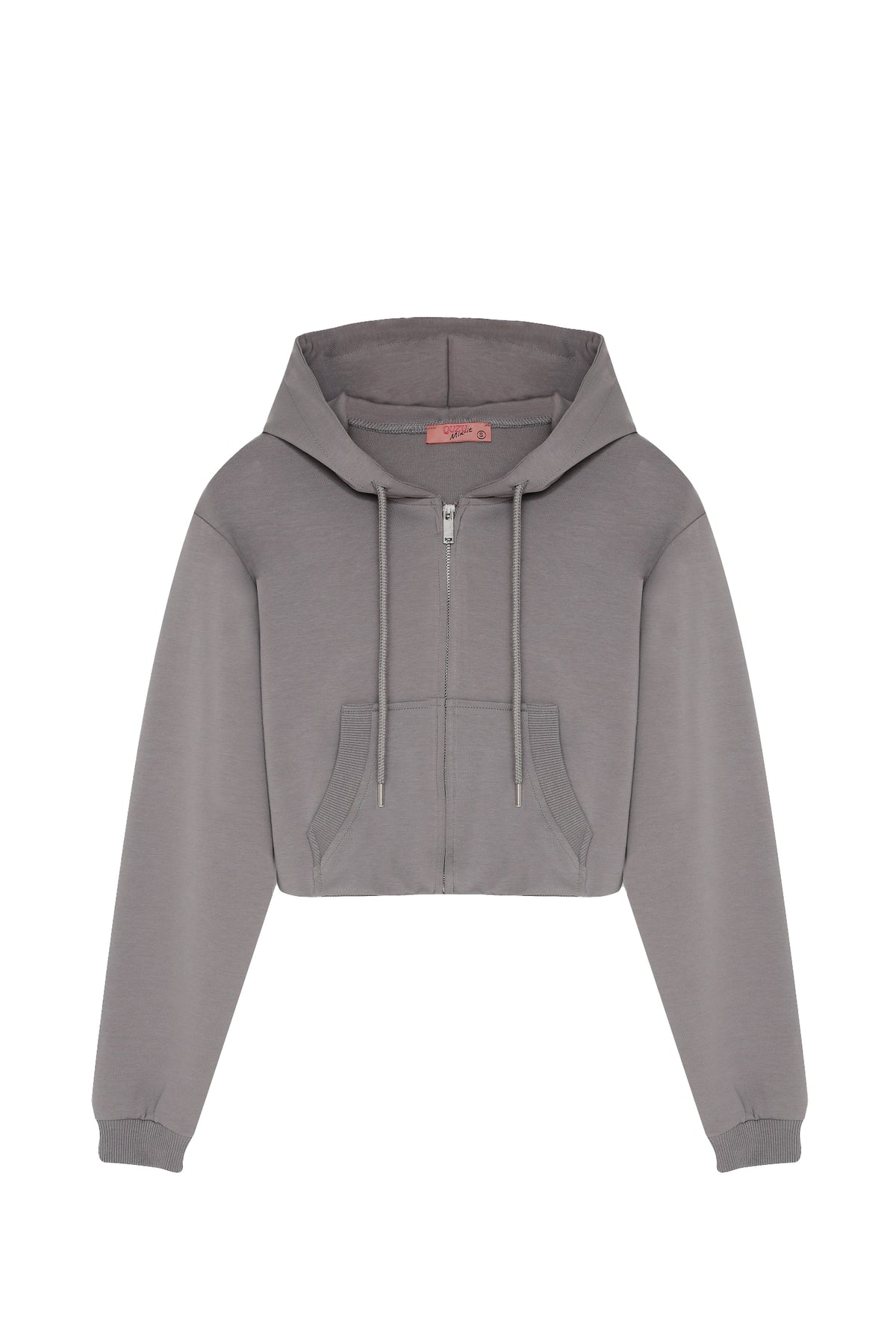 Kapüşonlu, önden kıvrım detaylı arkası düz, fermuar kapamalı, şardonsuz, ip büzgü detaylı, kanguru cepli, uzun kollu, kısa boy, basic sweatshirt.
