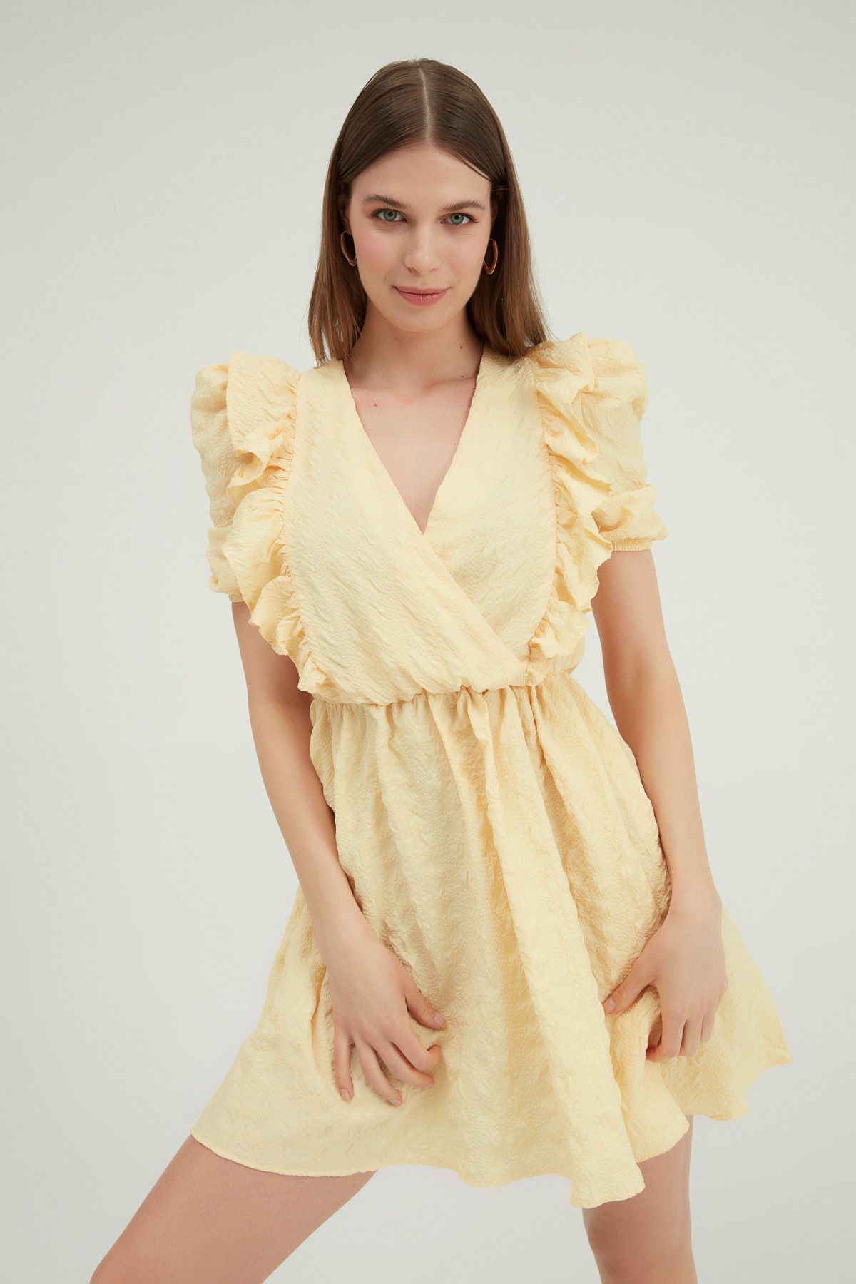 The ruffle detail on the chest, the Double Breasted Balloon Sleeve Mini Dress will enliven your summer with its color options. In your invitations, you can combine it with contrast colored open-front strappy shoes.