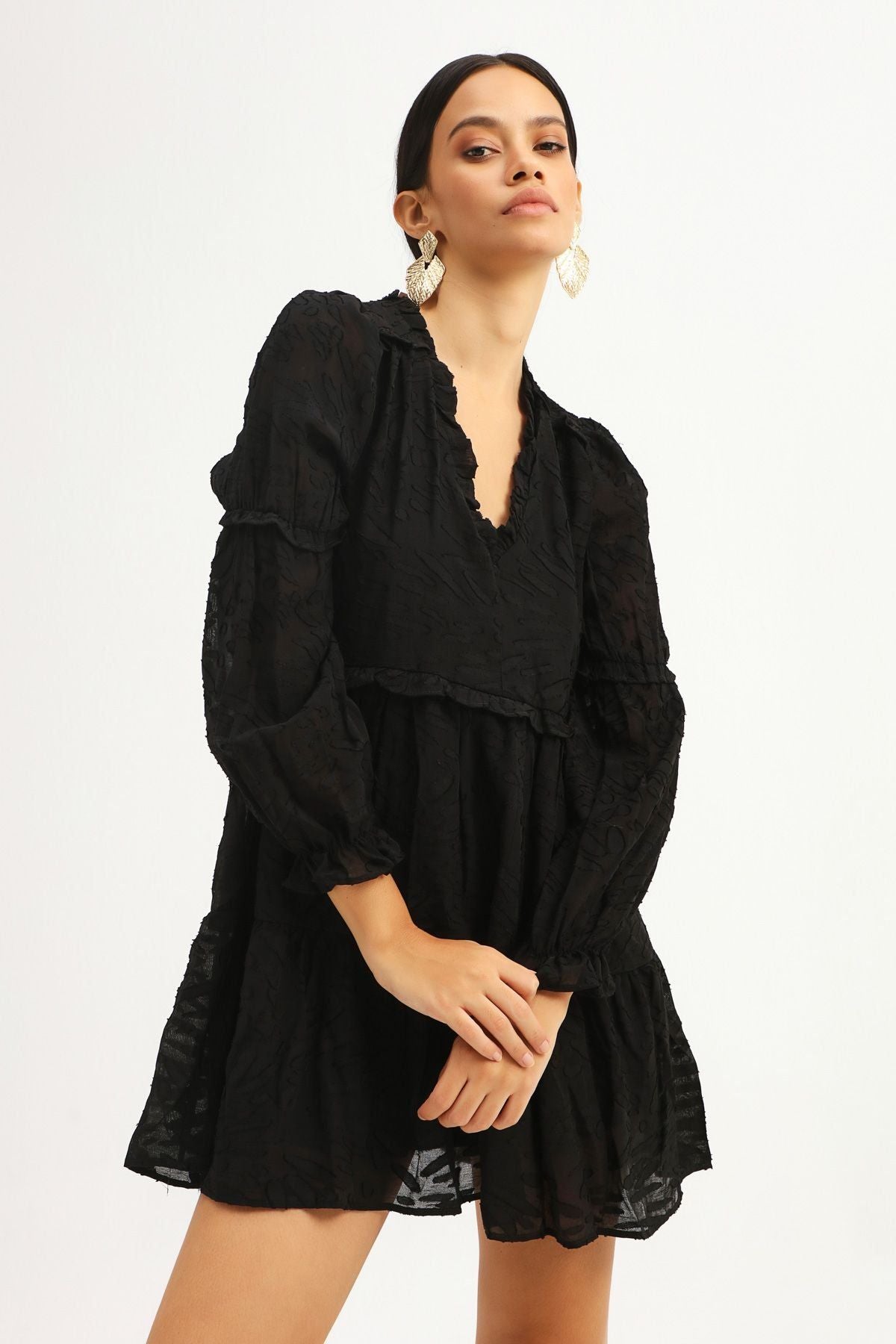 V Neck Frilly Dress Black