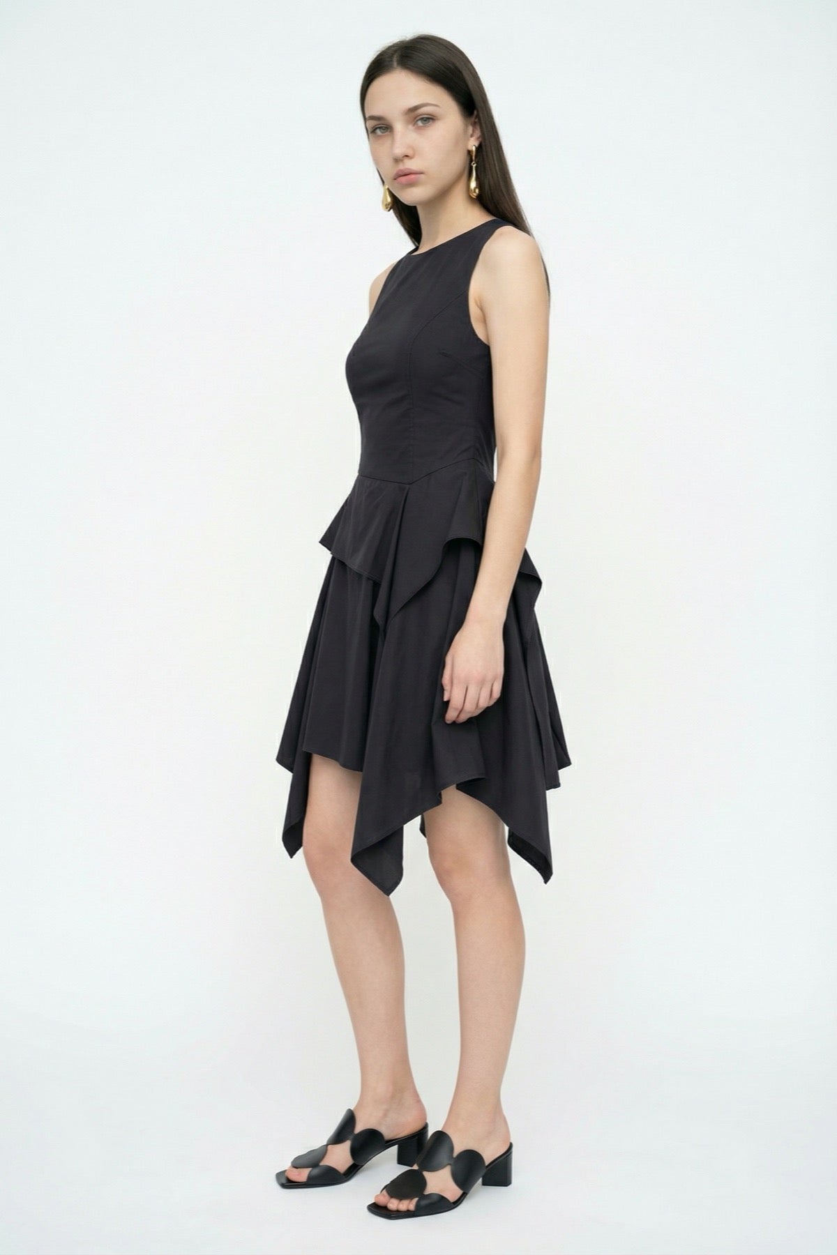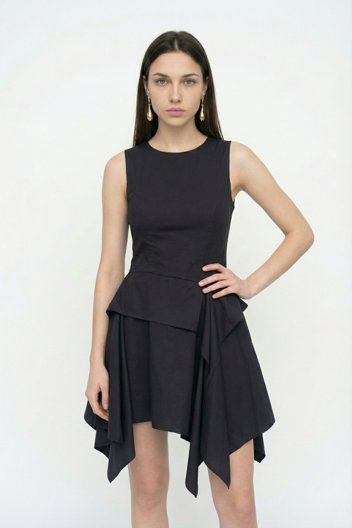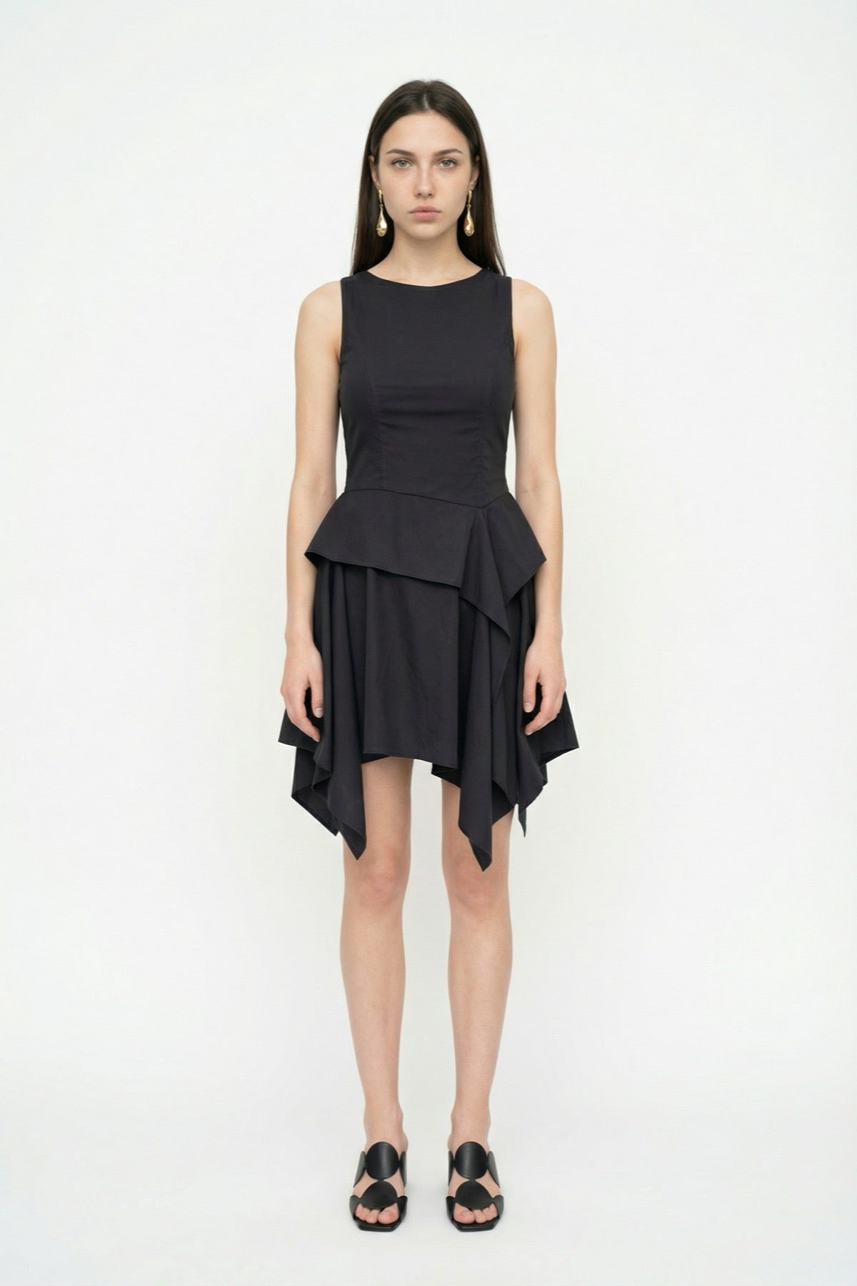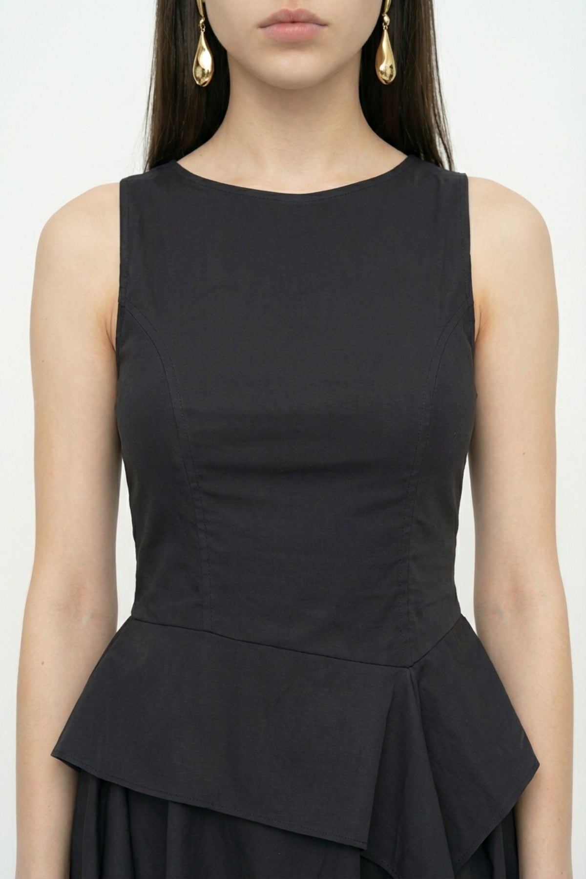 Asimetrik Volanlı Kolsuz Mini Elbise Siyah