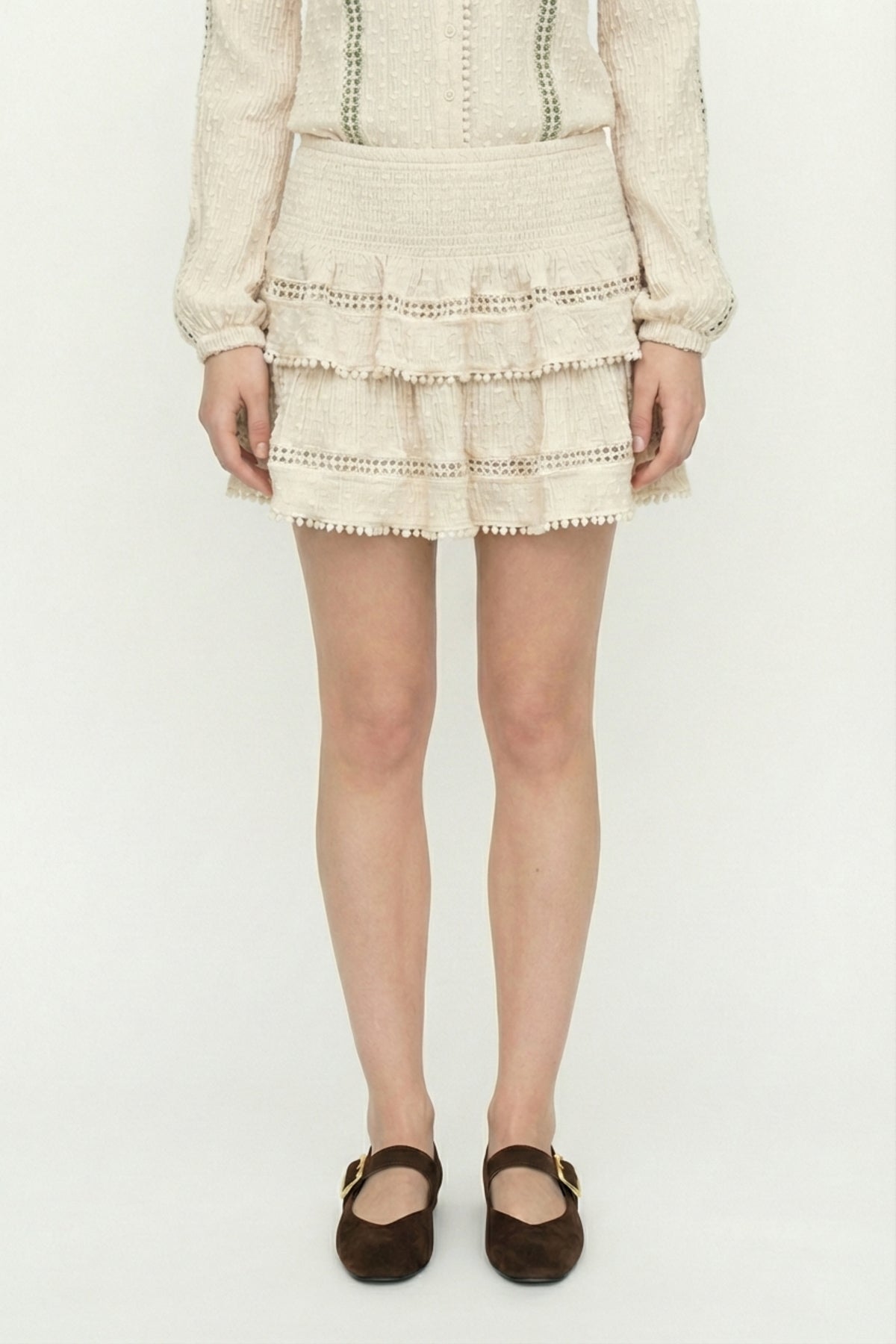 Beli Lastikli Dokulu Fırfırlı Mini Etek Bej