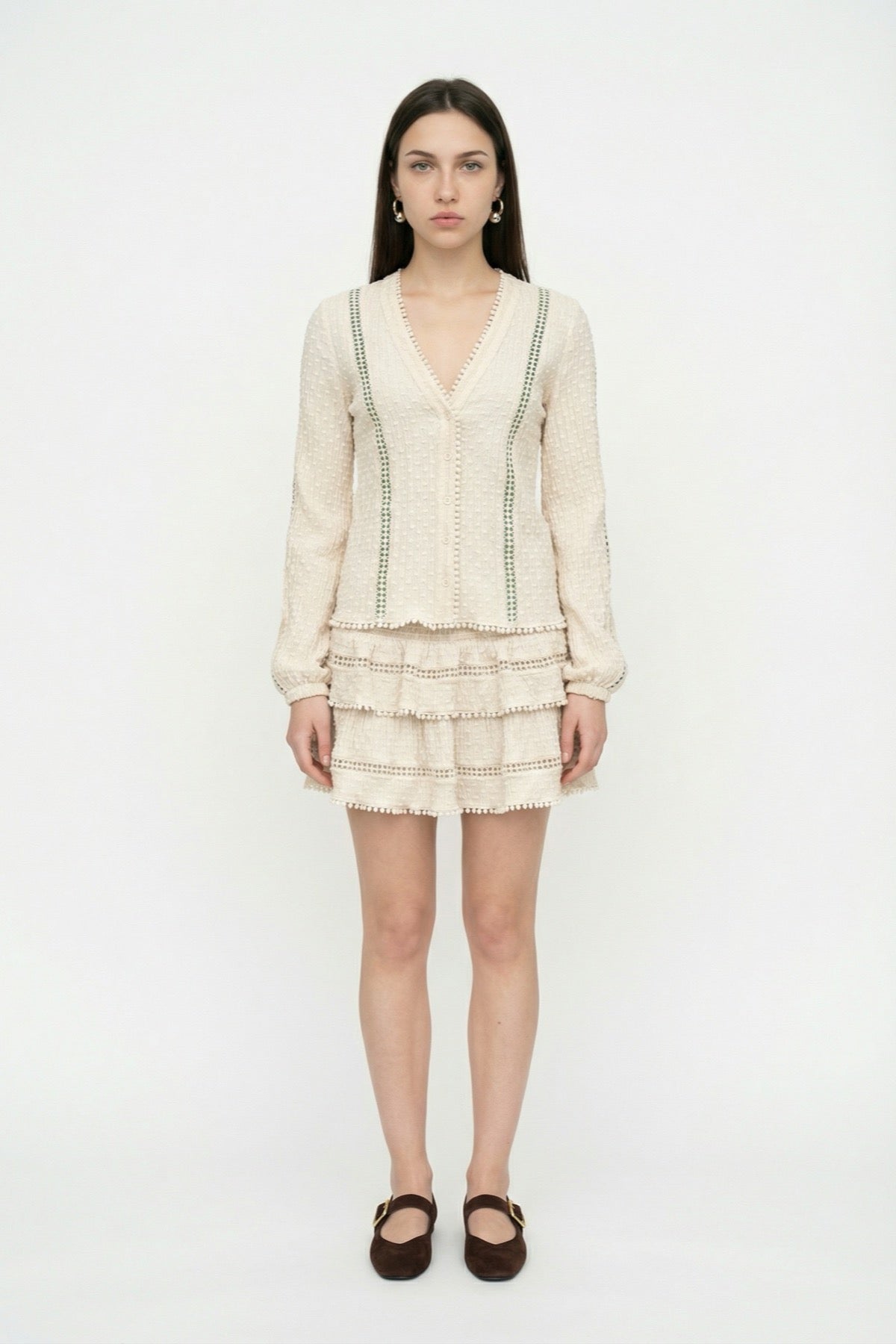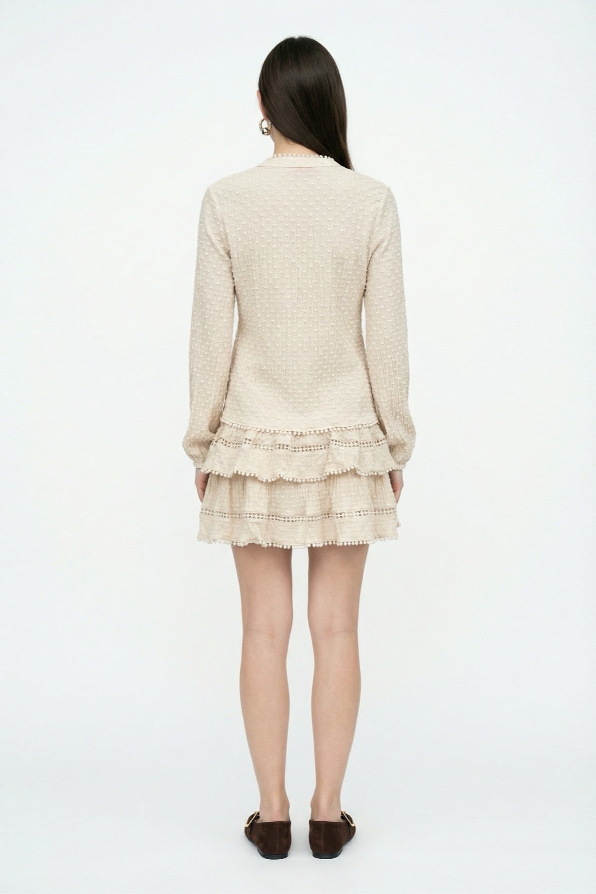 İçi astarlı, yüksek bel formda, fırfırlı, dantel şerit detaylı, dokulu, yandan fermuar kapamalı, mini boy etek.