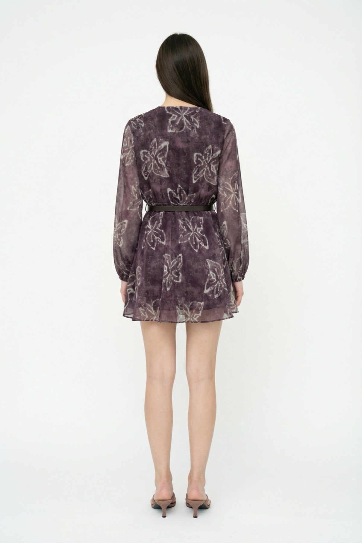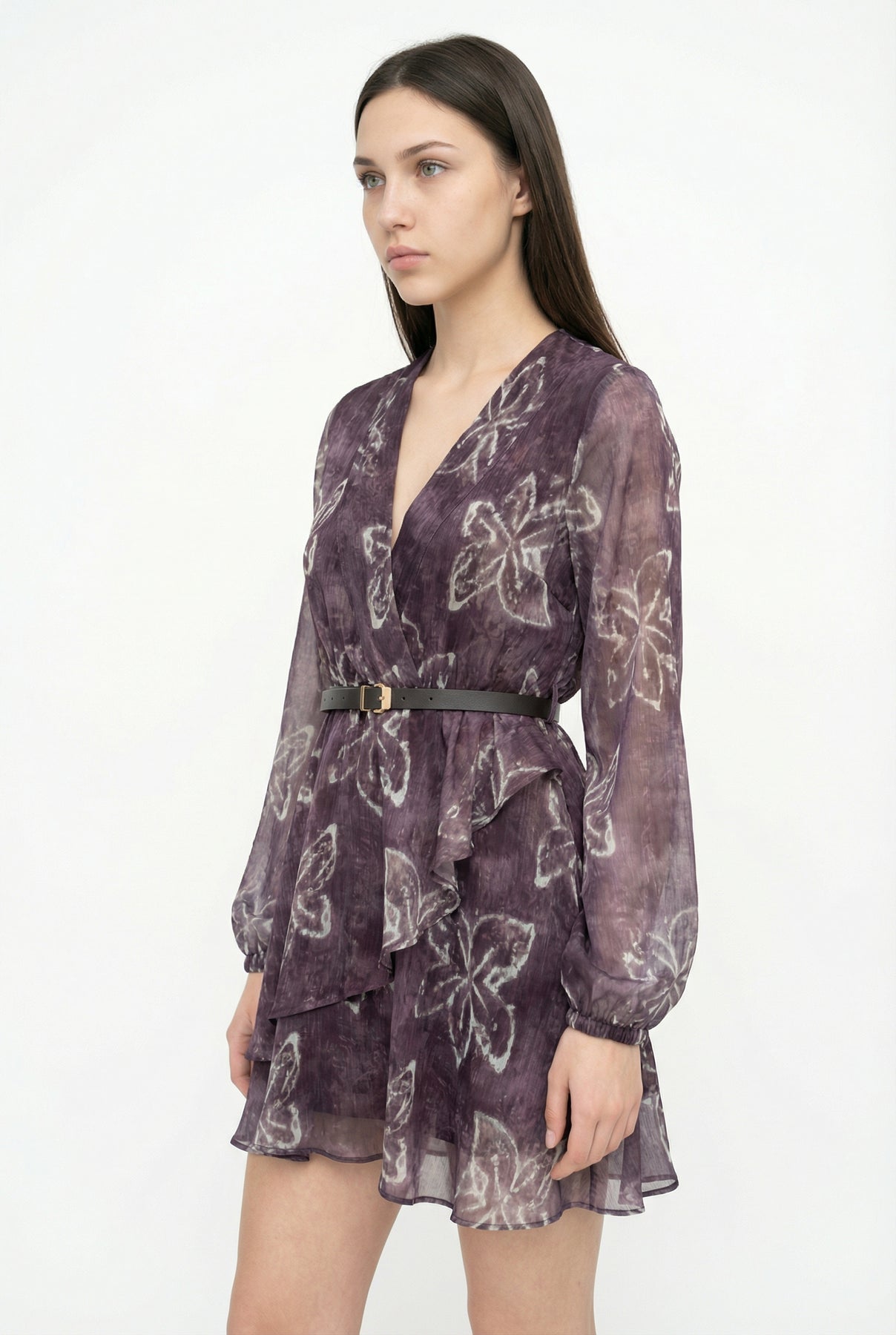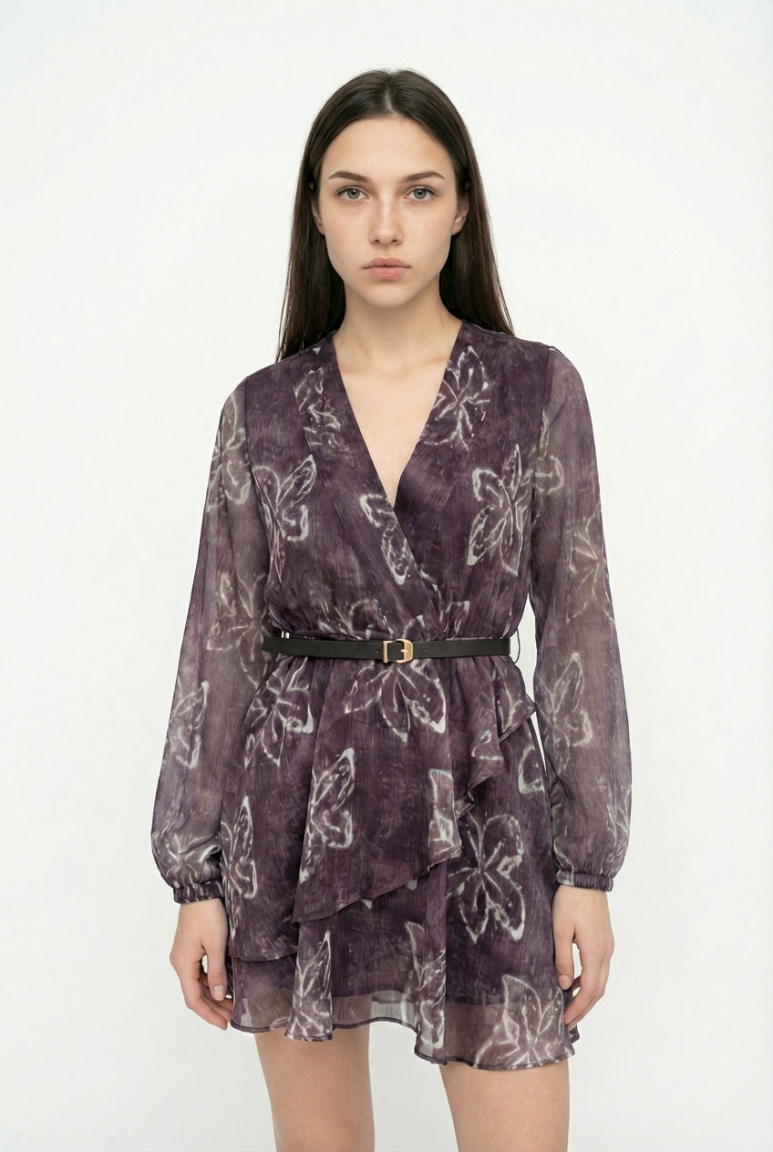 İçi kendi renginden astarlı, v yaka, çiçek desenli, uzun kollu, manşetleri lastikli, belden kemer detaylı, katlı volanlı, mini şifon elbise.