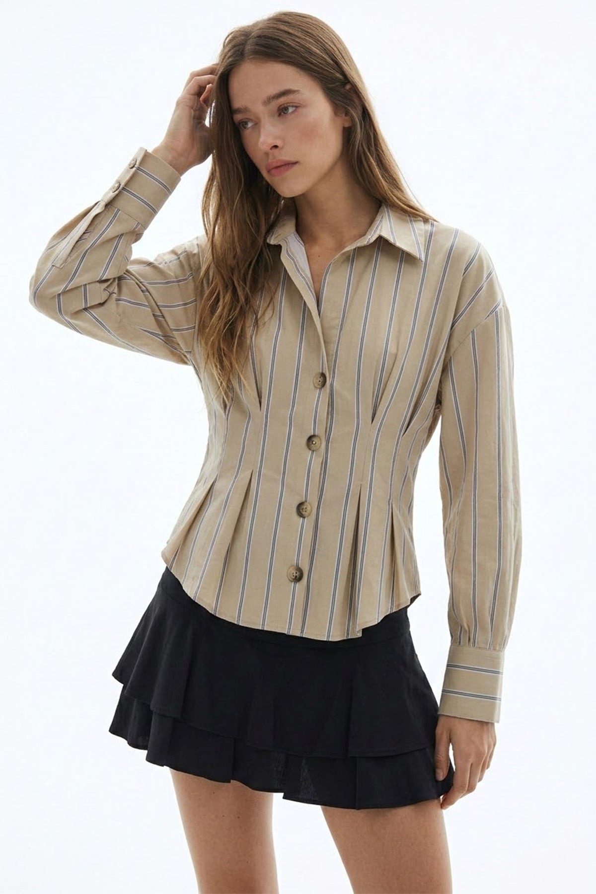 Çizgili Bele Oturan Gömlek Bej