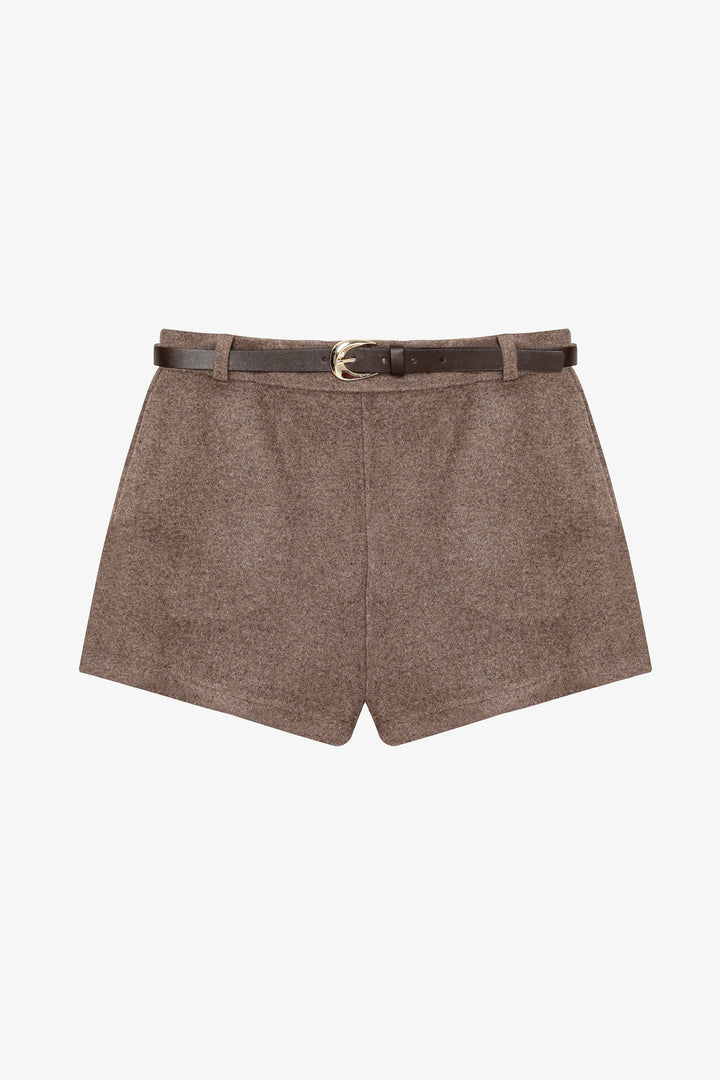 Yüksek bel, deri kemer detaylı, yandan fermuar kapamalı, yan cepli, düz kesim, mini boy kaşe şort.