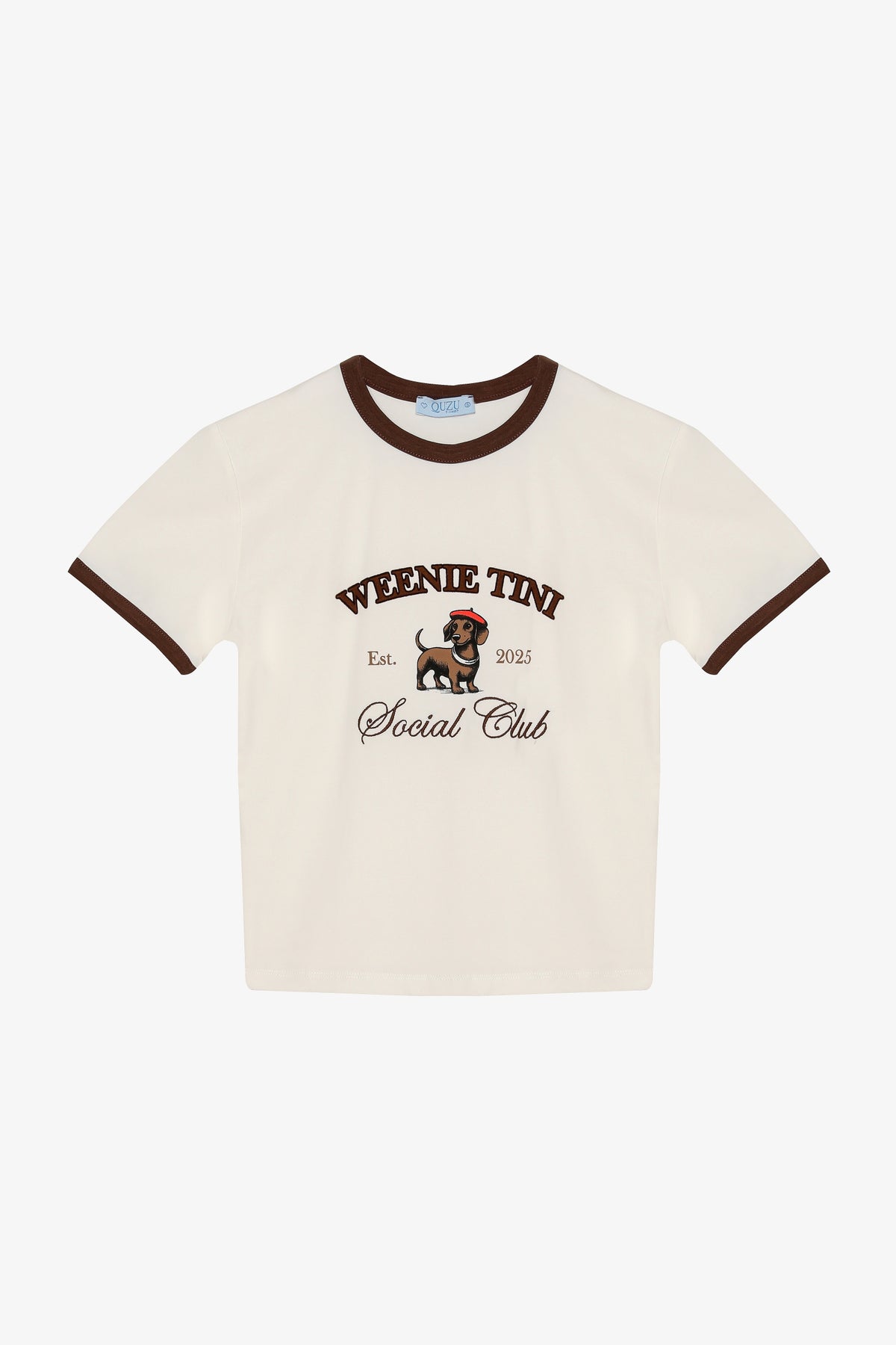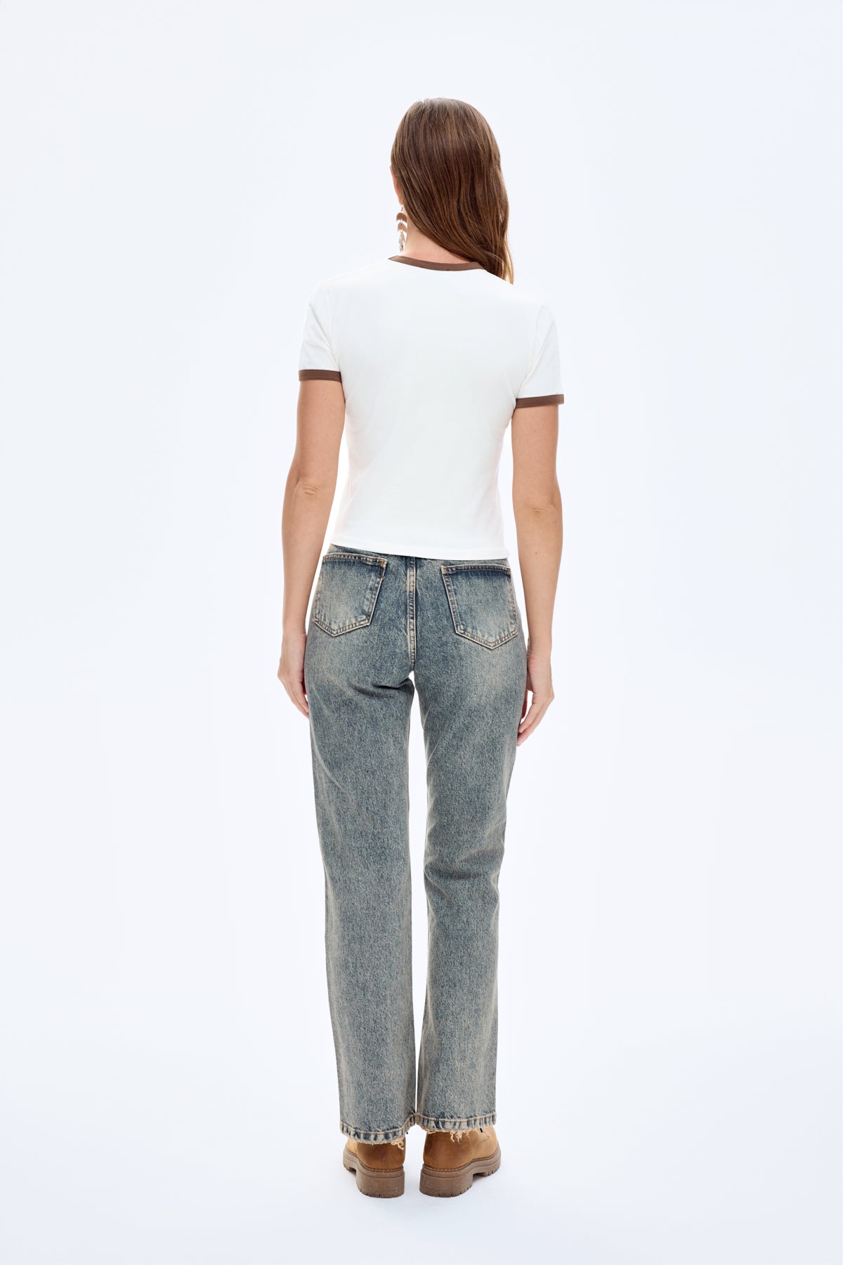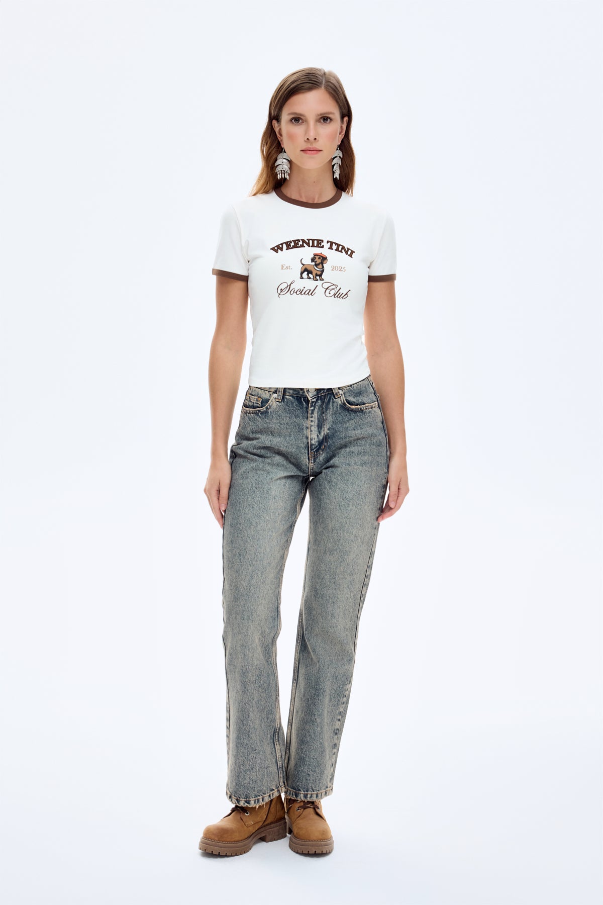 Kontrast Biyeli Yazı Baskılı Tişört Ekru