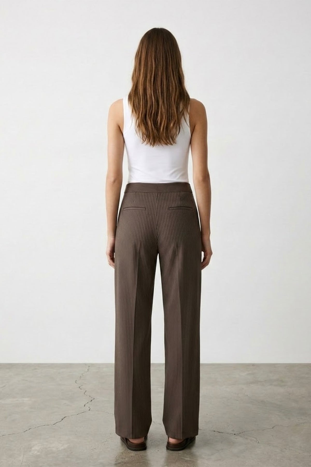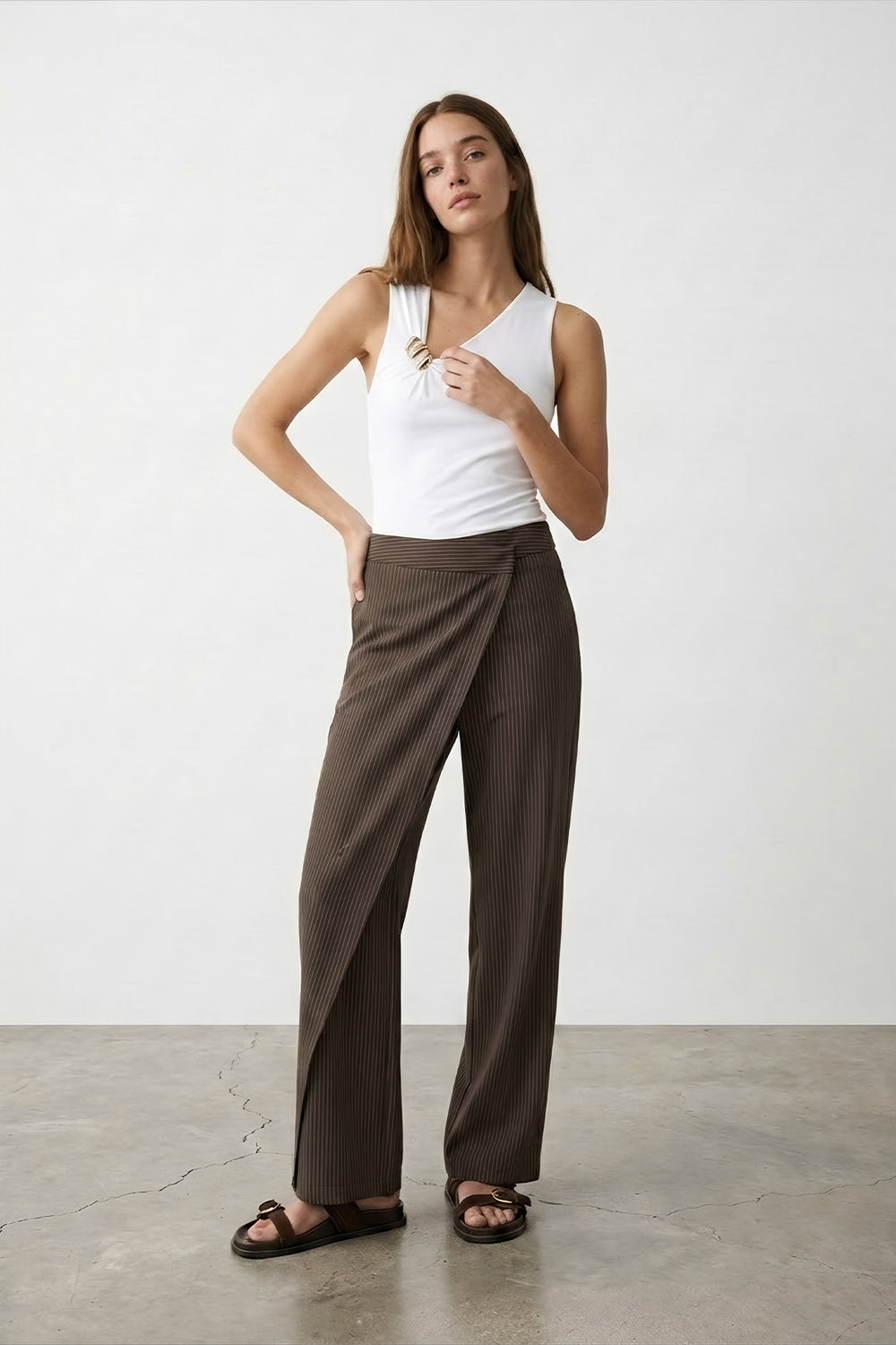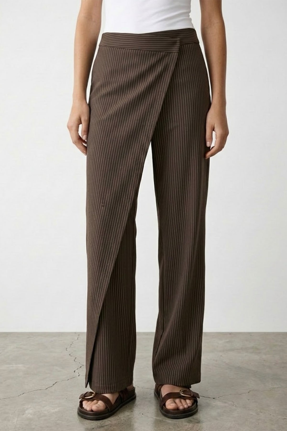 Kruvaze Kapamalı Çizgili Pantolon Kahverengi