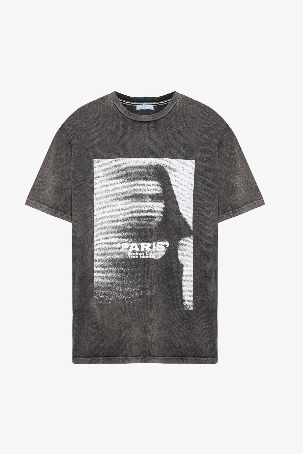 Yıkanmış efektli kumaş dokulu, ön kısmı paris baskı detaylı, bisiklet yaka, kısa kollu, modern ve sportif görünüm sunan oversize tişört.