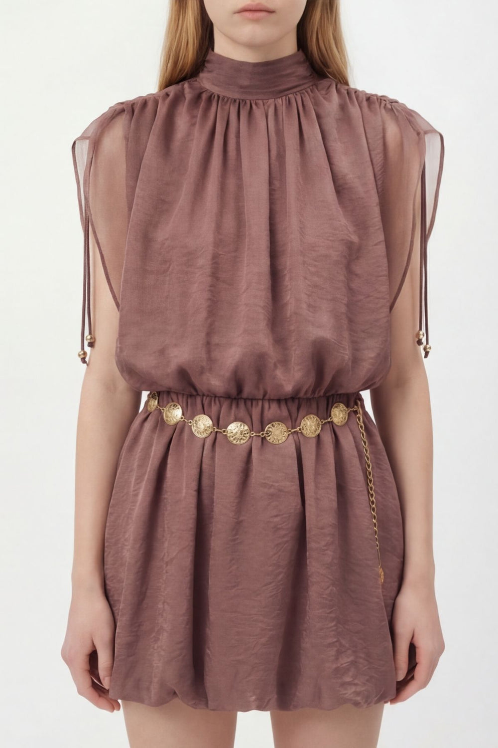 Yarasa Kol Zincir Kemerli Mini Elbise Kahverengi
