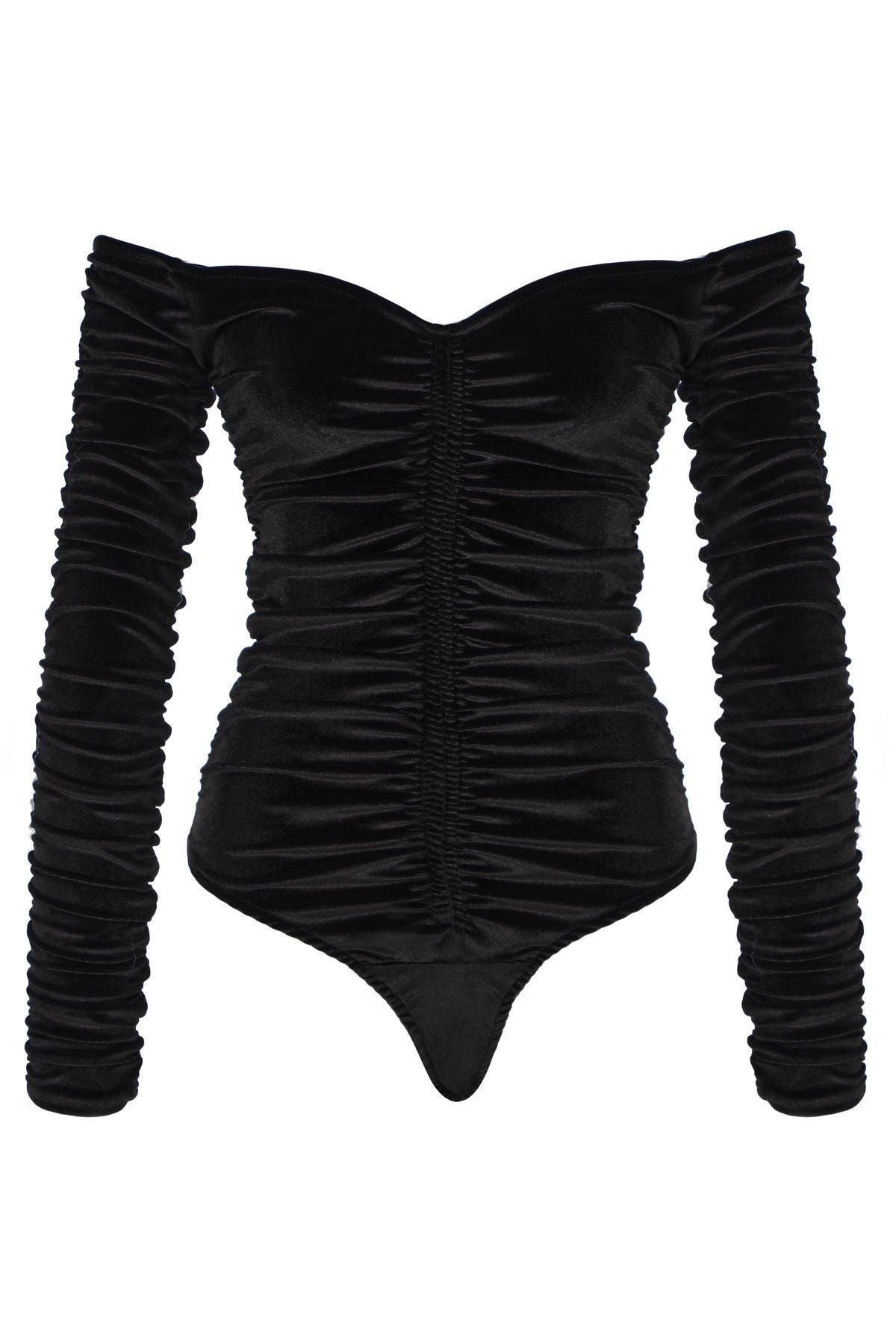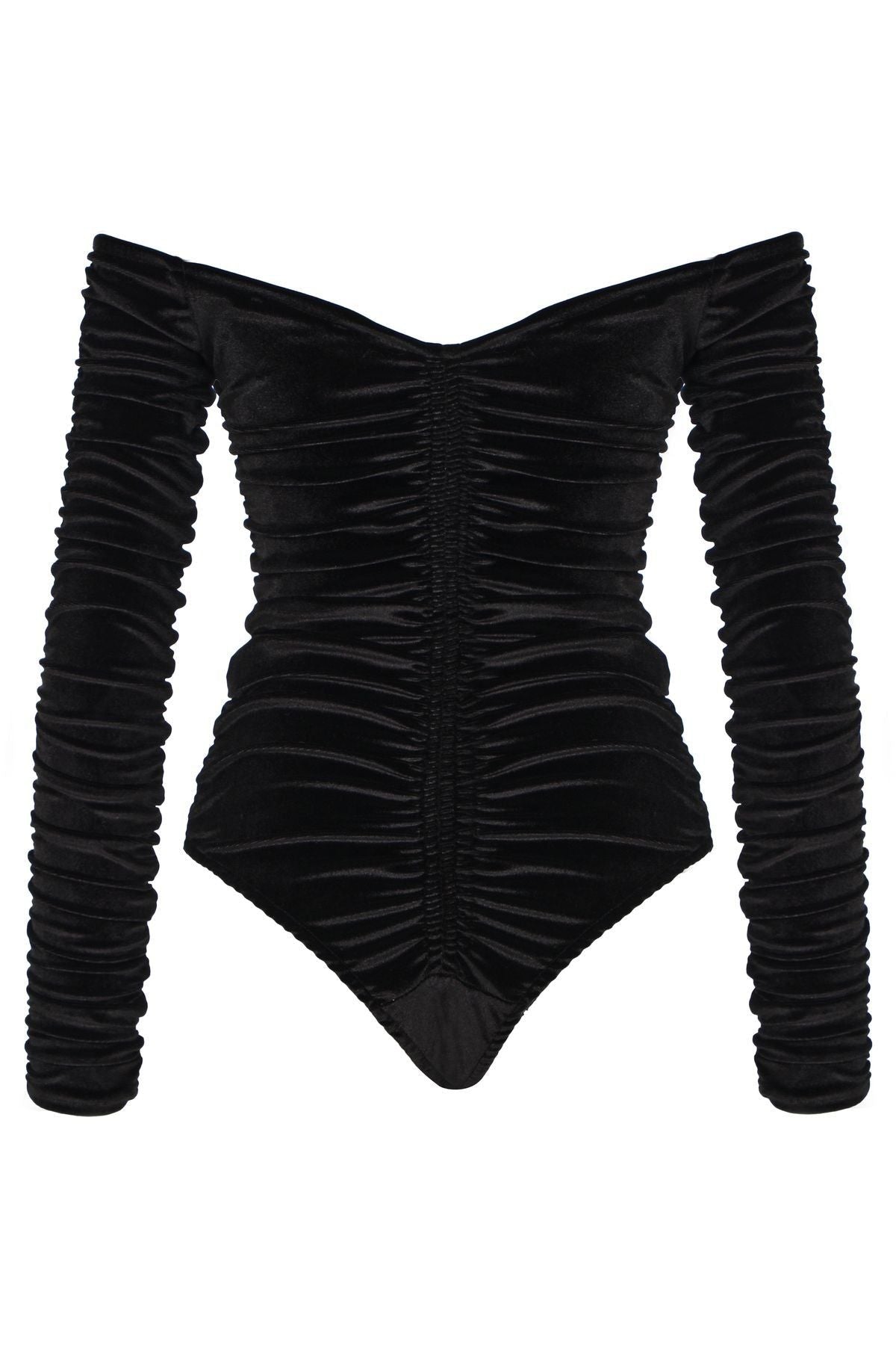 The charm of velvet is combined with the shirred V-neck bodysuit that reveals the body lines! You can look at it as the savior of house parties and special occasions! The best choice for a cool, inspiring and impressive combination! If you want to create wonders with miniskirts, tight-fitting jeans and stocking boots, this bodysuit should be yours! Returns are not valid for this product for hygiene reasons.