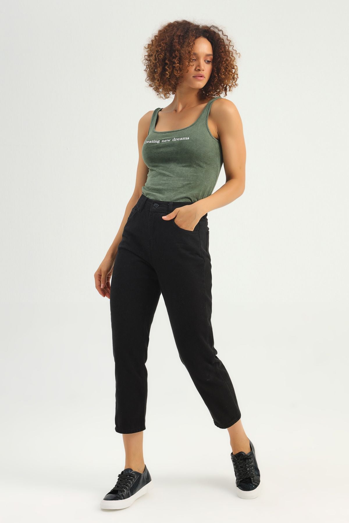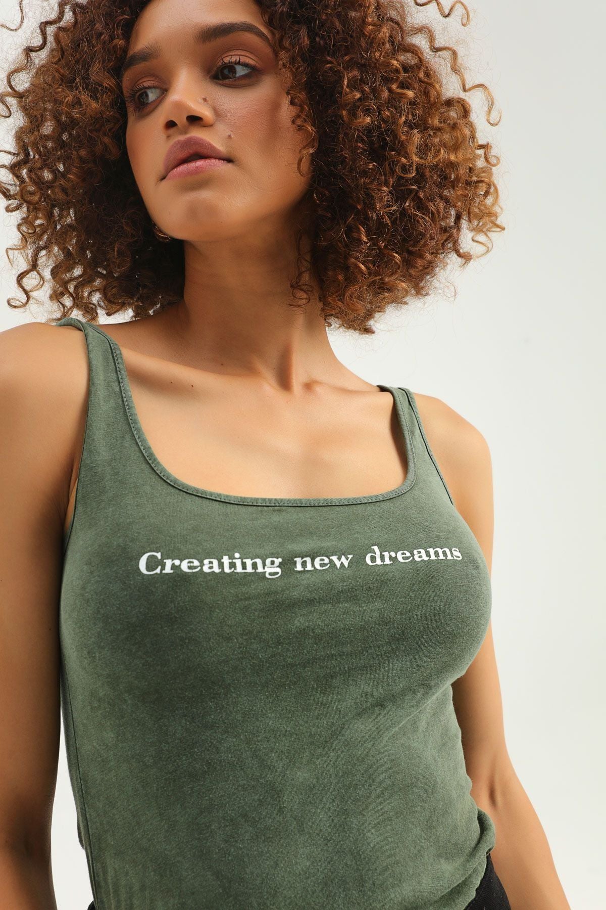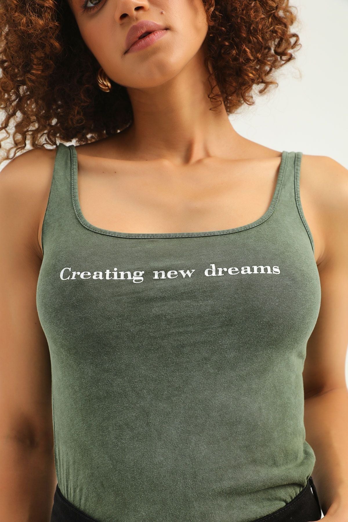 Letter Printed Strap Bodysuit Khaki