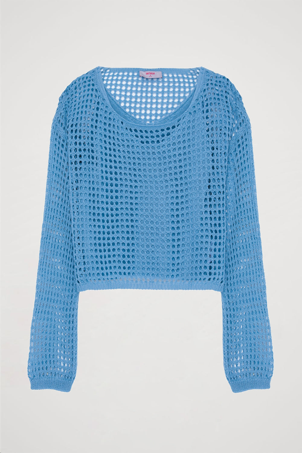 File dokulu, crop boy, bisiklet yaka, uzun kollu, iç kısmı askılı bluzlu, zarif ve modern ajurlu ikili triko.