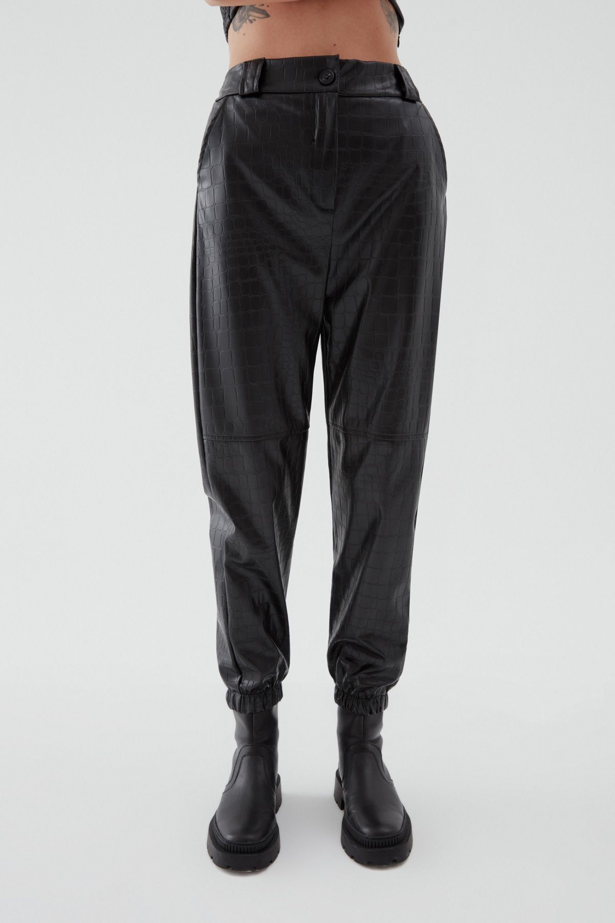 With its eye-catching texture, you can reflect your style with high waist leather trousers. The comfortable fit jogger trousers with elasticated hems have pockets on the back and front, zip fastening and top button fastening. It provides a comfortable wear with the shirred structure of the back waist.