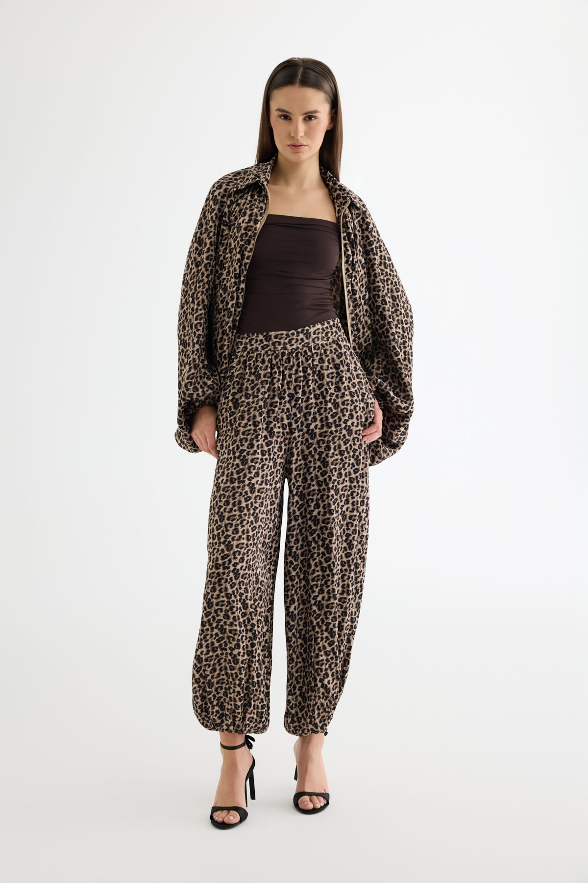 Leopar desenli, beli ve paçaları lastik detaylı, yandan fermuar kapamalı, cepli, jogger saten pantolon.