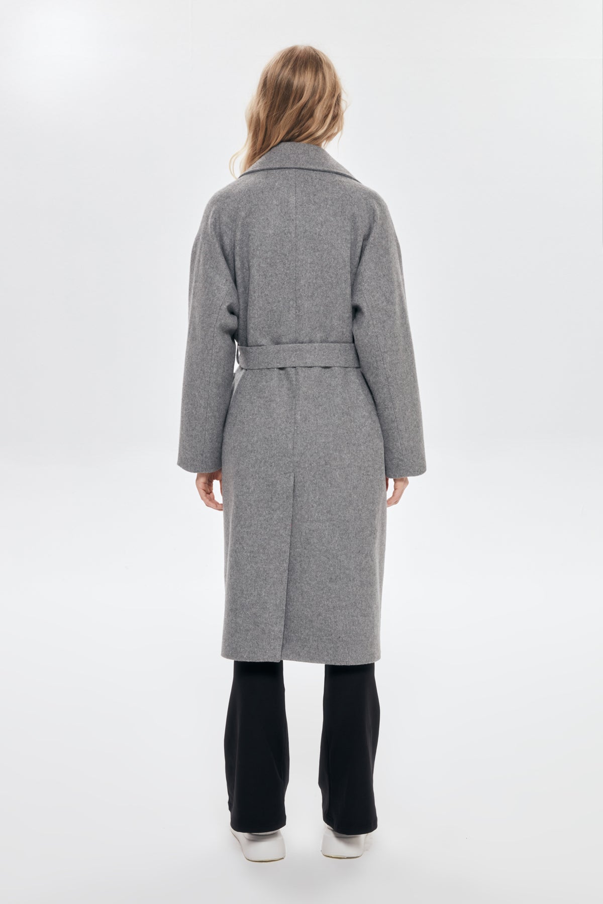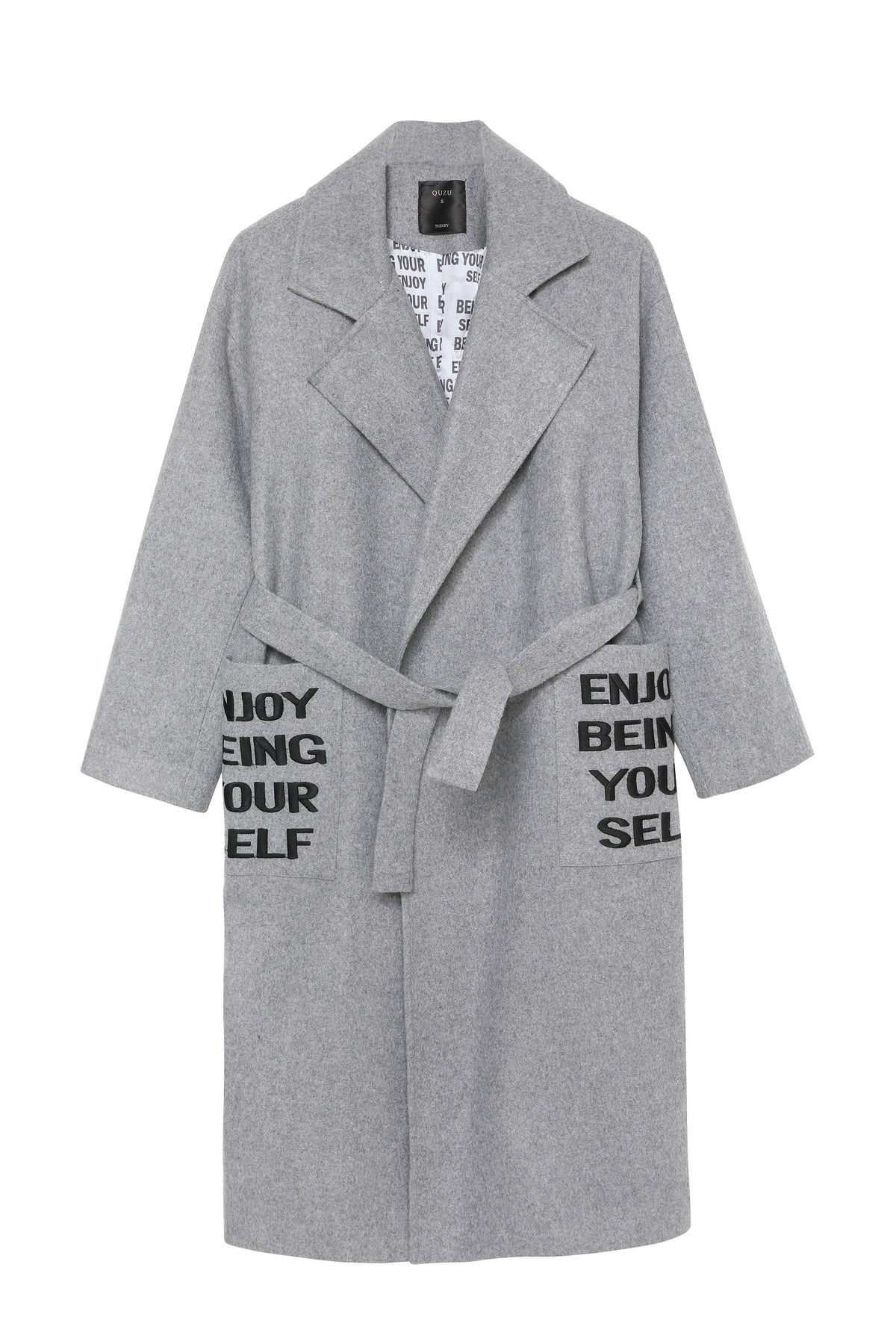 Pamuk karışımlı, astarı yazı desenlİ, tek ceplİ, belİ bağlama detaylı, kruvaze yaka uzun kaban.