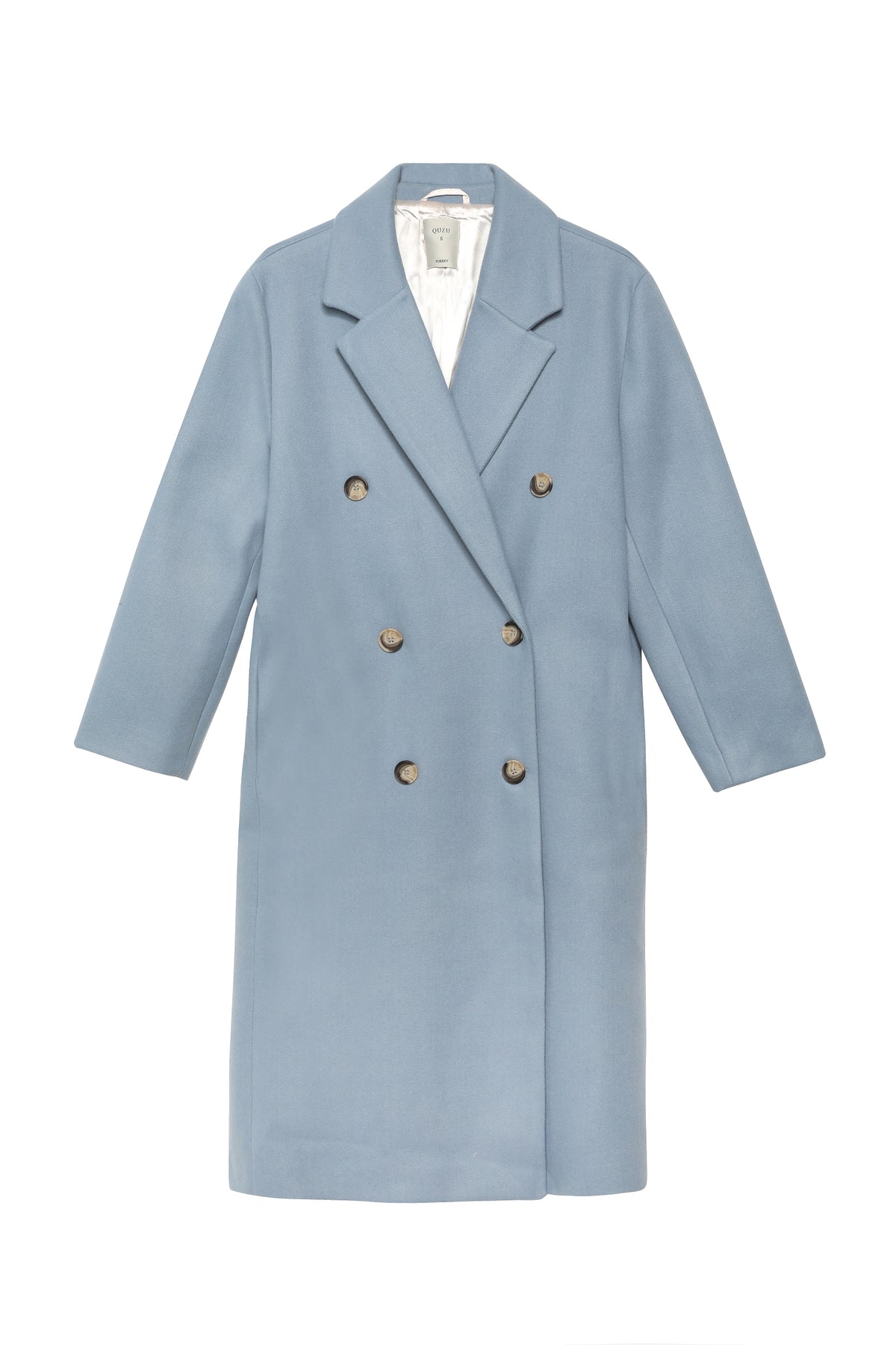 Long coat with a double-breasted collar, cream-colored interior lining, two side pockets, a back vent, oversized cut away from the body, long sleeves, large button detail.