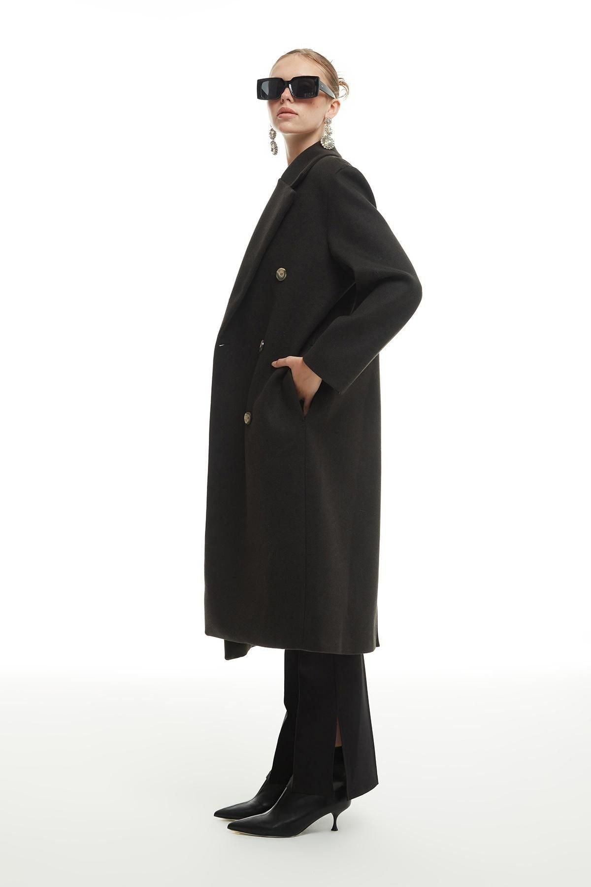 Long coat with a double-breasted collar, cream-colored interior lining, two side pockets, a back vent, oversized cut away from the body, long sleeves, large button detail.