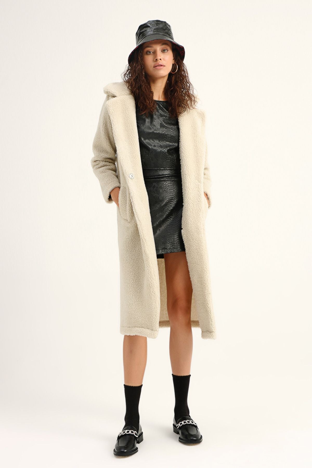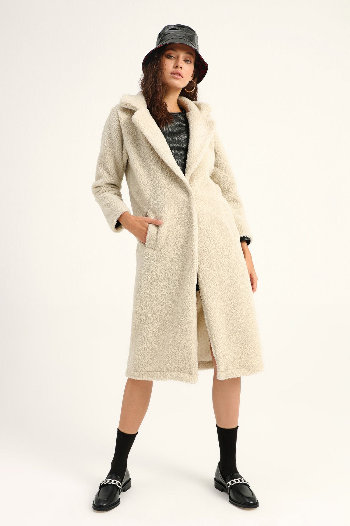 Plush coat model; With its soft touch and body-fitting pattern, it offers an ideal option to warm you in all conditions, even in cold weather. In addition to the advantage of being long, the plush coat model increases the dose of elegance with its collar stance and single button detail. Plush coats, one of the trendy pieces of the season, will help you find a perfect match with the knitwear accompanying your mini skirts!
