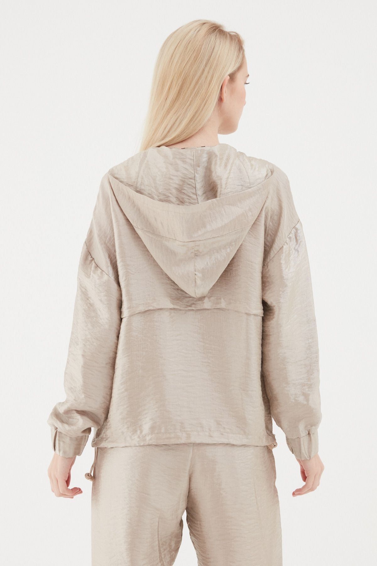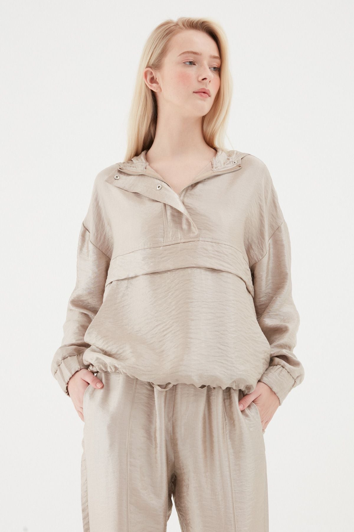 Pleated Waist Hooded Sweatshirt Beige