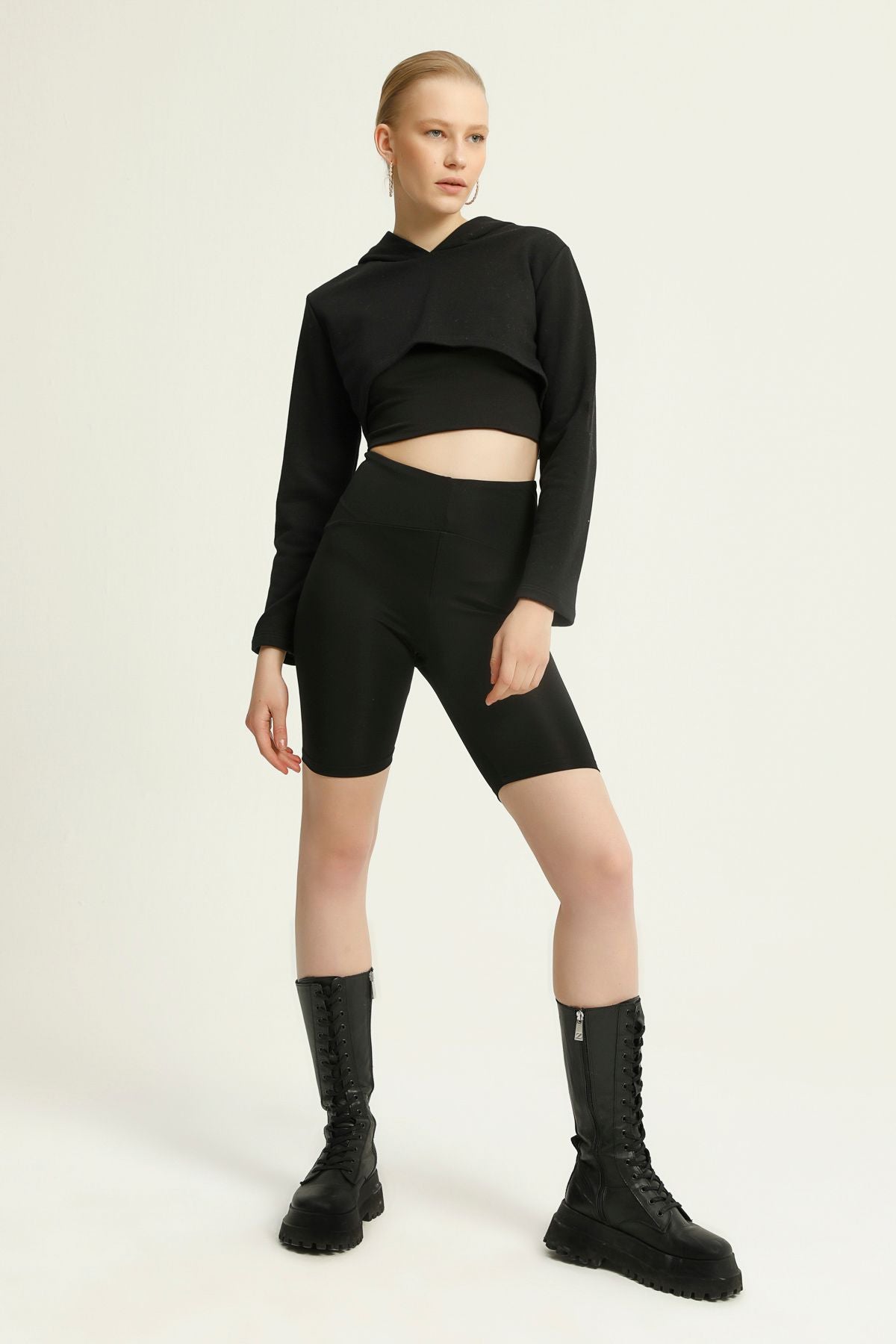 Trend alarm is ringing for you! Enjoy being cool while attracting all the attention with the hooded crop sweatshirt model, which is the most favorite part of the season! You can create set combinations by using the same color jogger as the sweatshirt model, or you can get ready to travel like a fashion icon with your high waist leather pants. You will not want to take off your soft cotton sweatshirt for a long time under all conditions and conditions.