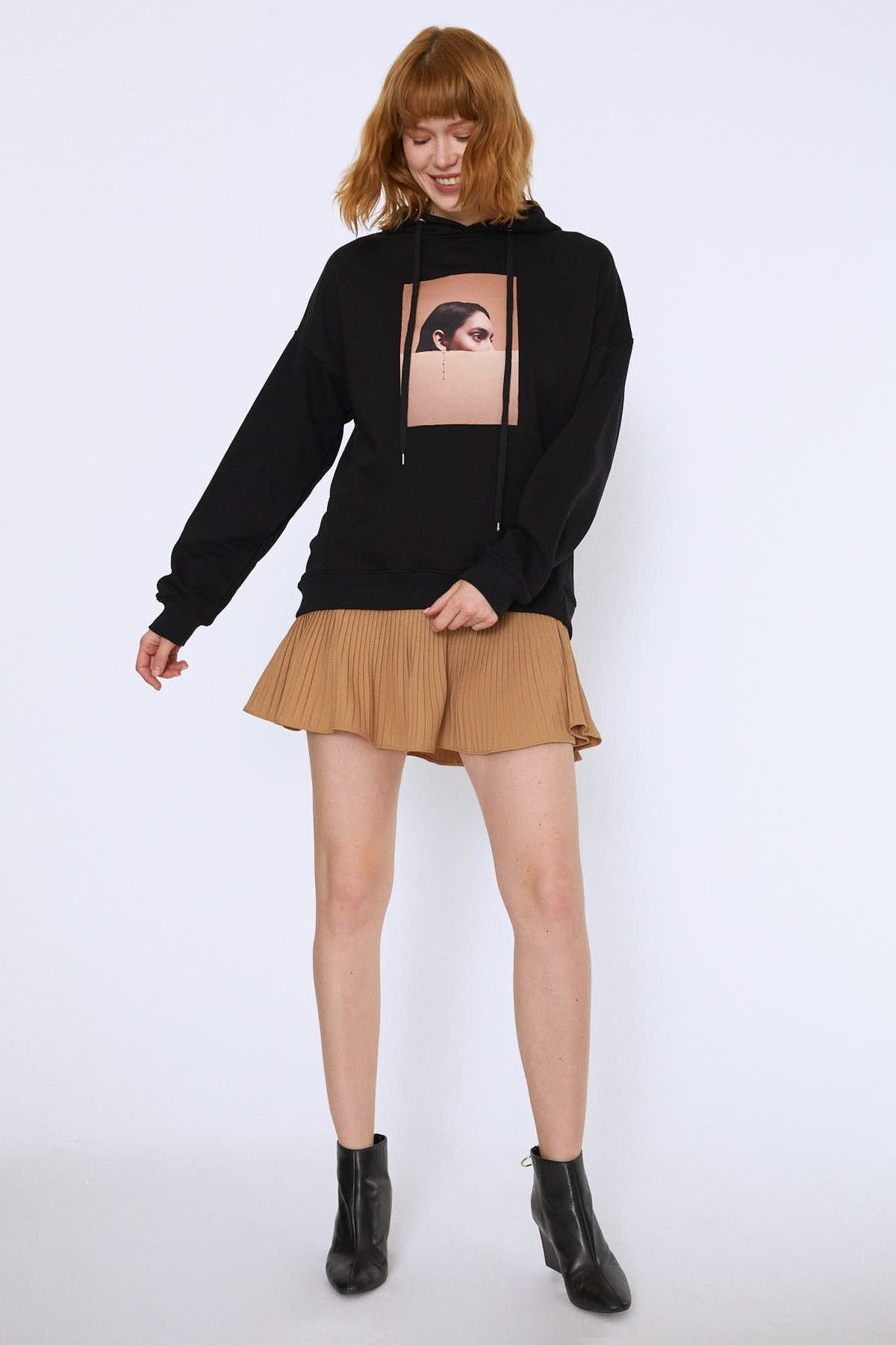 The sweatshirt, which gives a cool look with its hood, puts its unique signature on its style with its print on the front. You can create a strong effect by completing your sweatshirt with a sporty and striking identity with mini skirts.